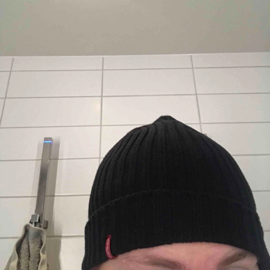 Skitsnygg svart stickad mössa mössa från Levi’s. Man kan vika upp och ner nedersta kanten och märket syns och är rätt ändå