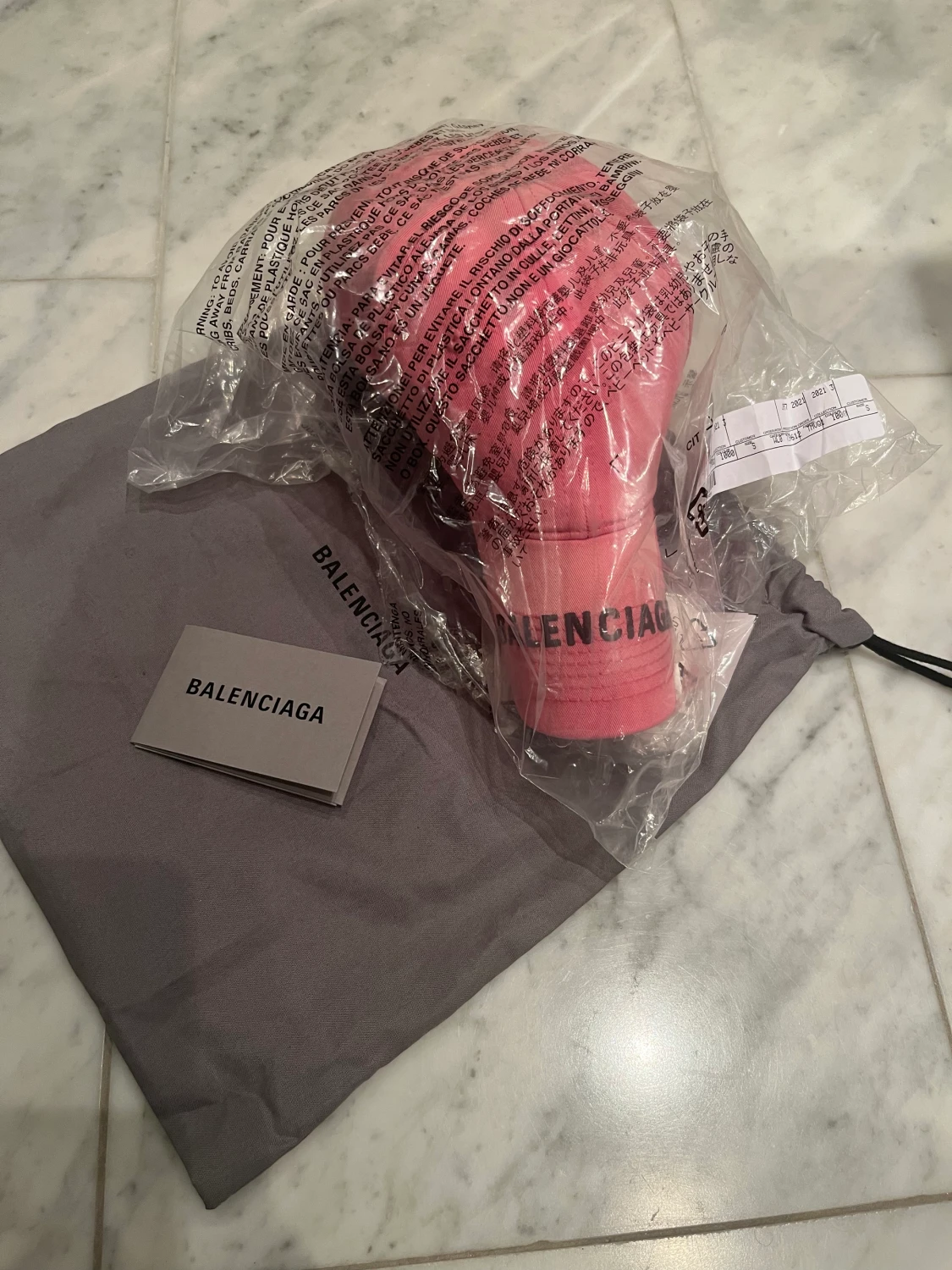 Balenciaga Cap in Fuchsia Brand new with tags Original receipt Size L Color Sunfaded fuchsia/pink • Cotton material • Adjustable Velcro tab at back • Balenciaga logo embroidered on the front • Ventilation eyelets embroidered on top • Made in Italy