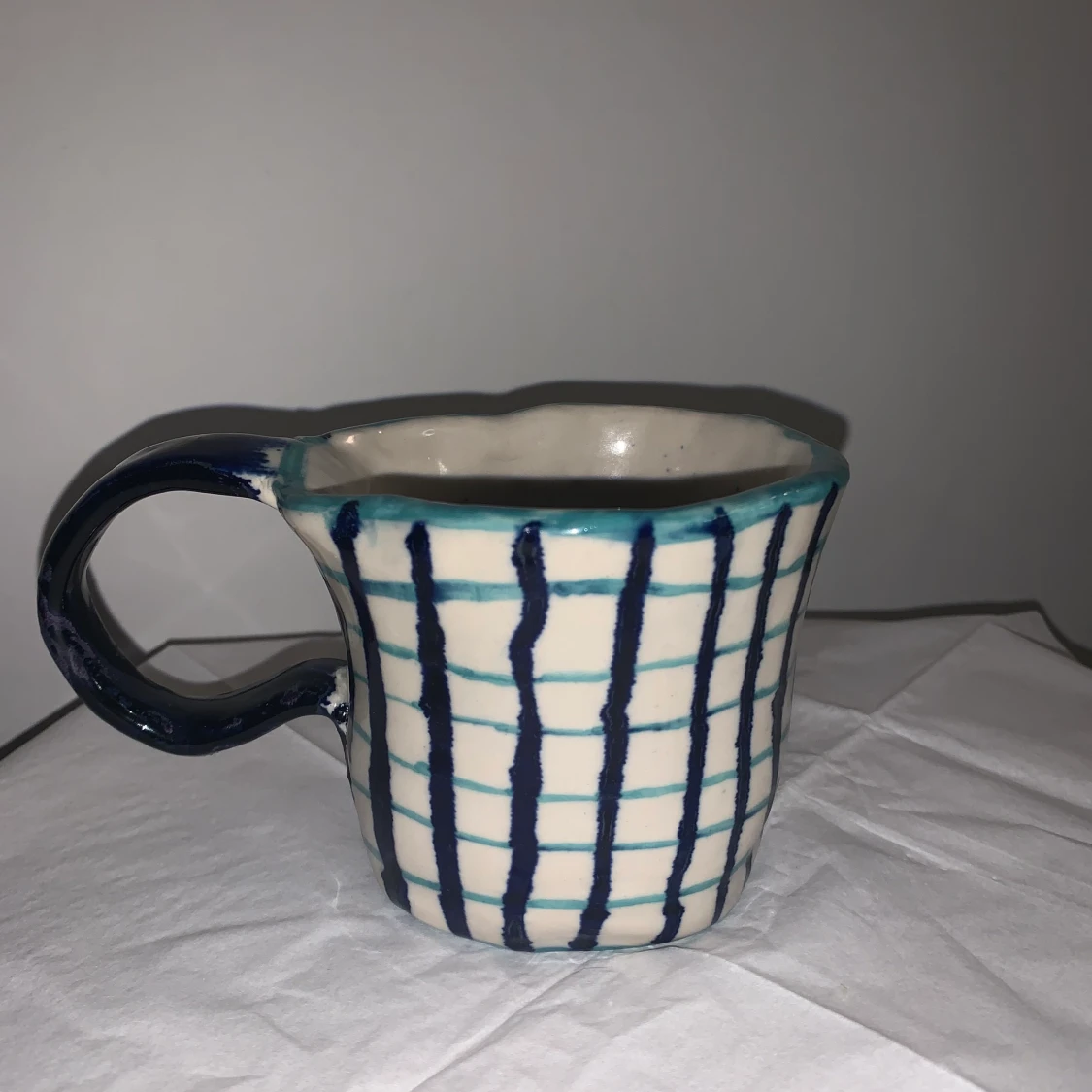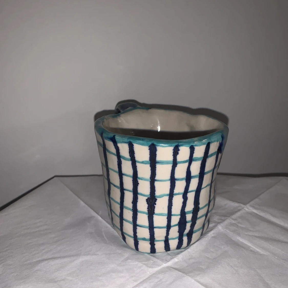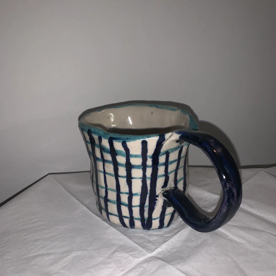 En handgjord kopp i keramik med ett vitt yttre men som är ofärgad inuti. Den har två nyanser av blått på ränderna samt samt ett blått öra.