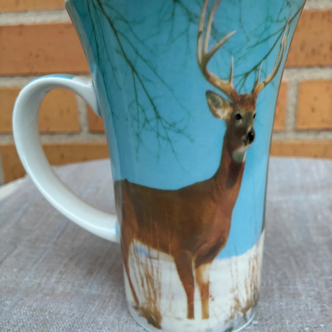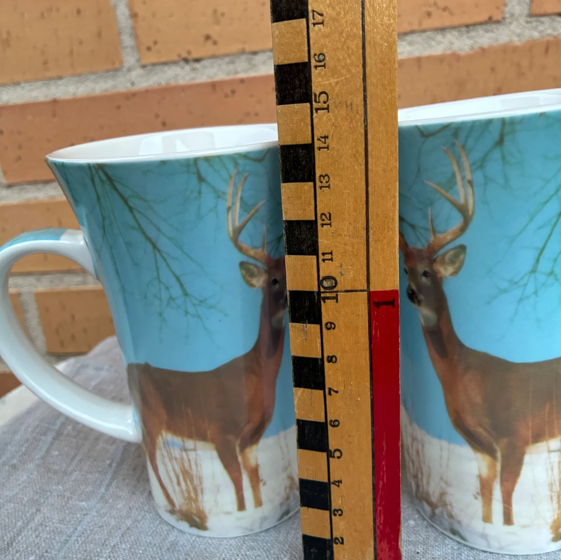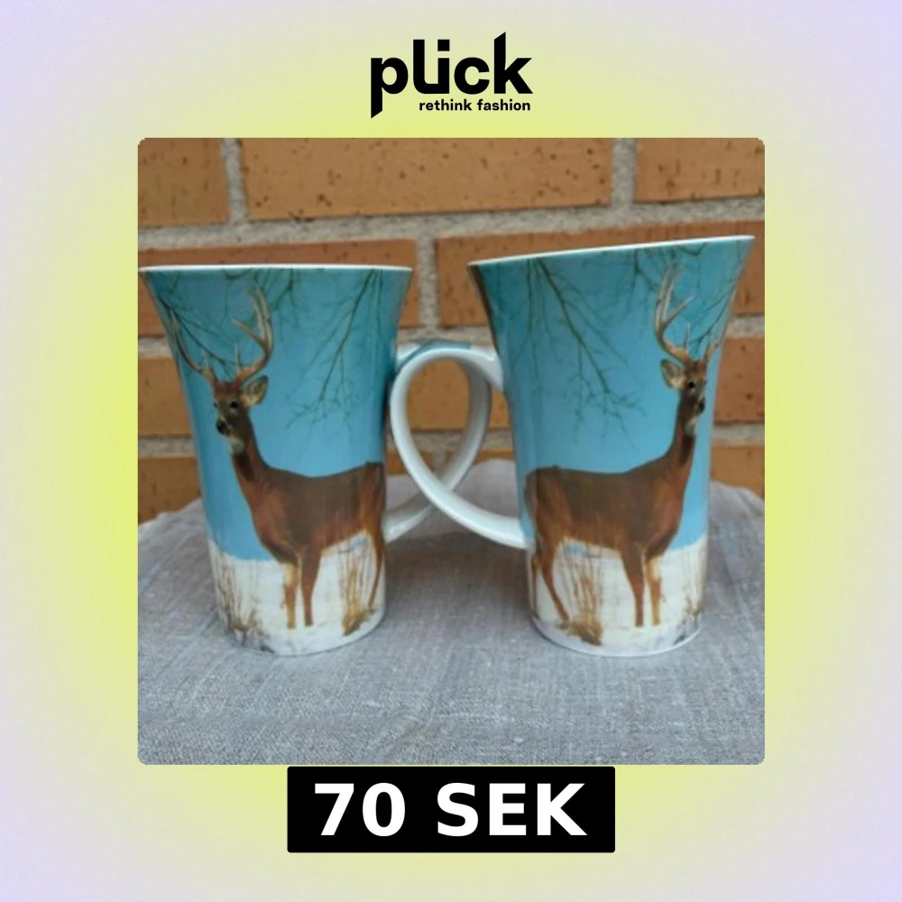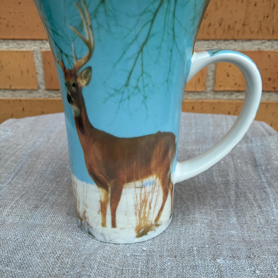 Två keramikmuggar med vackert hjortmotiv mot blå bakgrund. Muggarna är ca 10 cm i diameter och har ett vinterlandskap. Fint skick utan synliga sprickor eller nagg, perfekt för kaffe eller te. Dekorativa och unika för naturälskare.