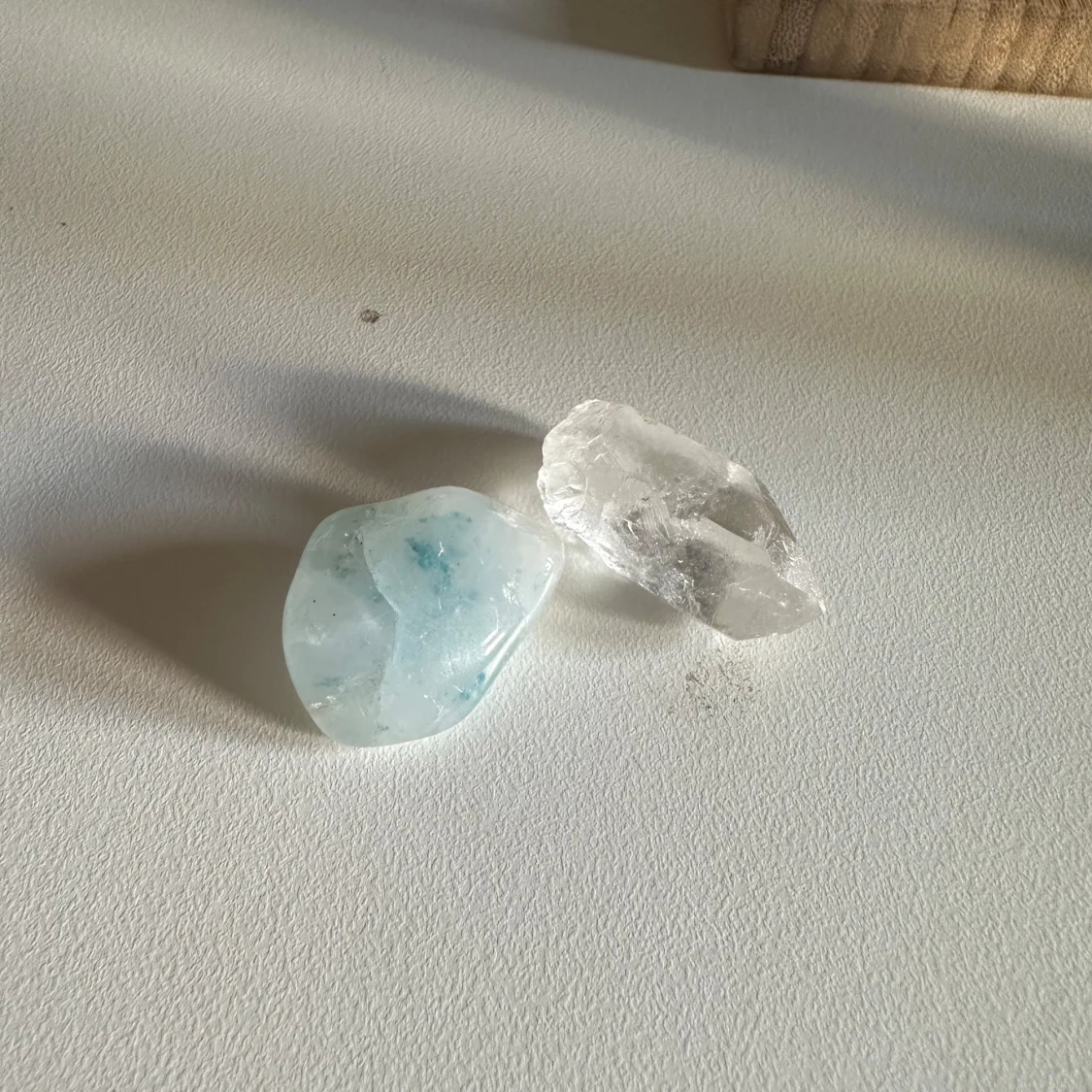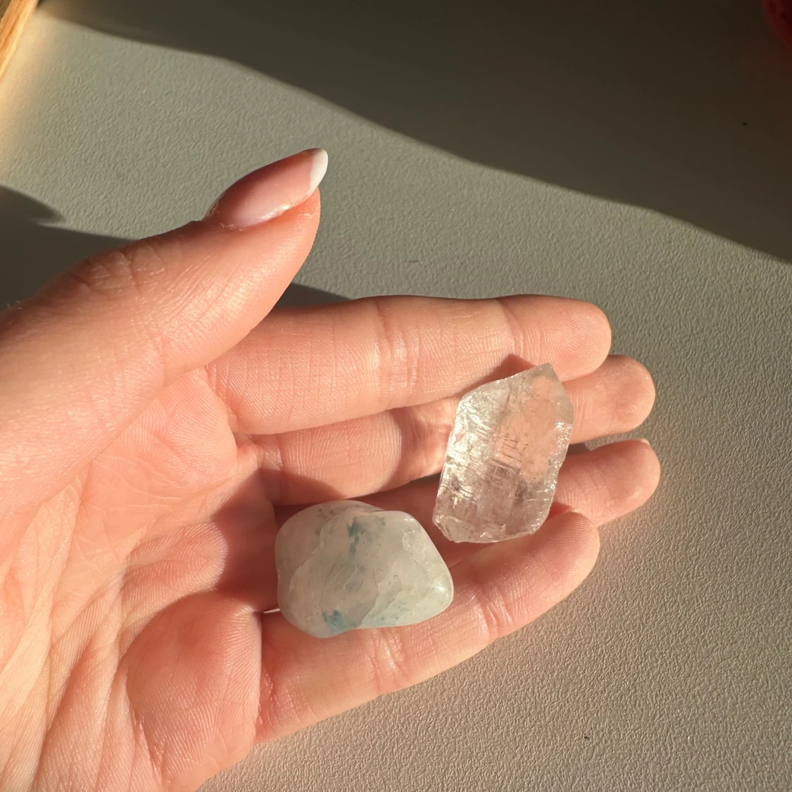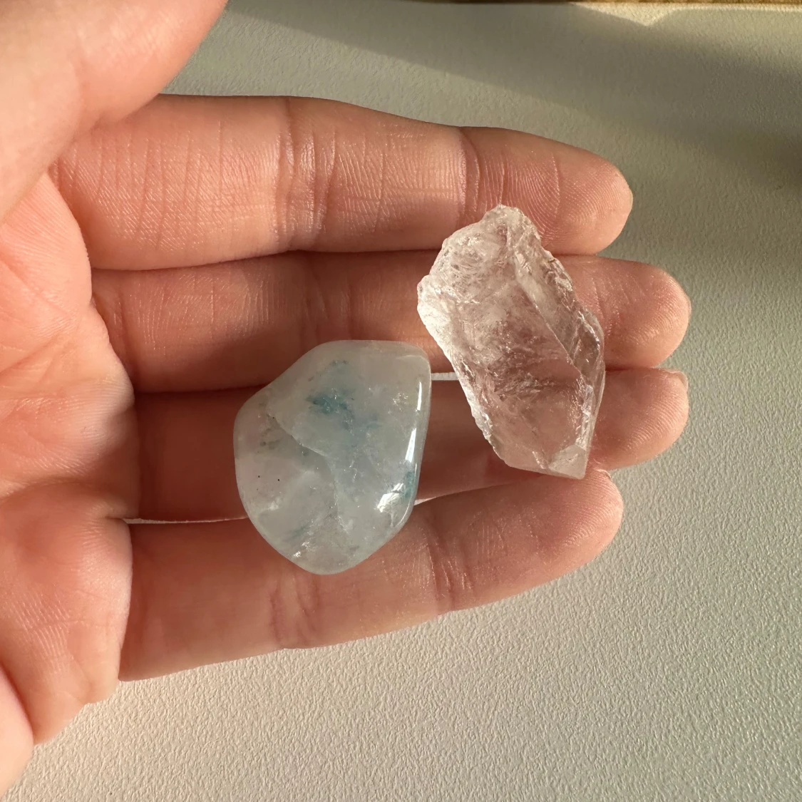 Säljer två såå fina kristaller. En rå kvartspets och en tumlad akvamarin. Säljs tilsammans!