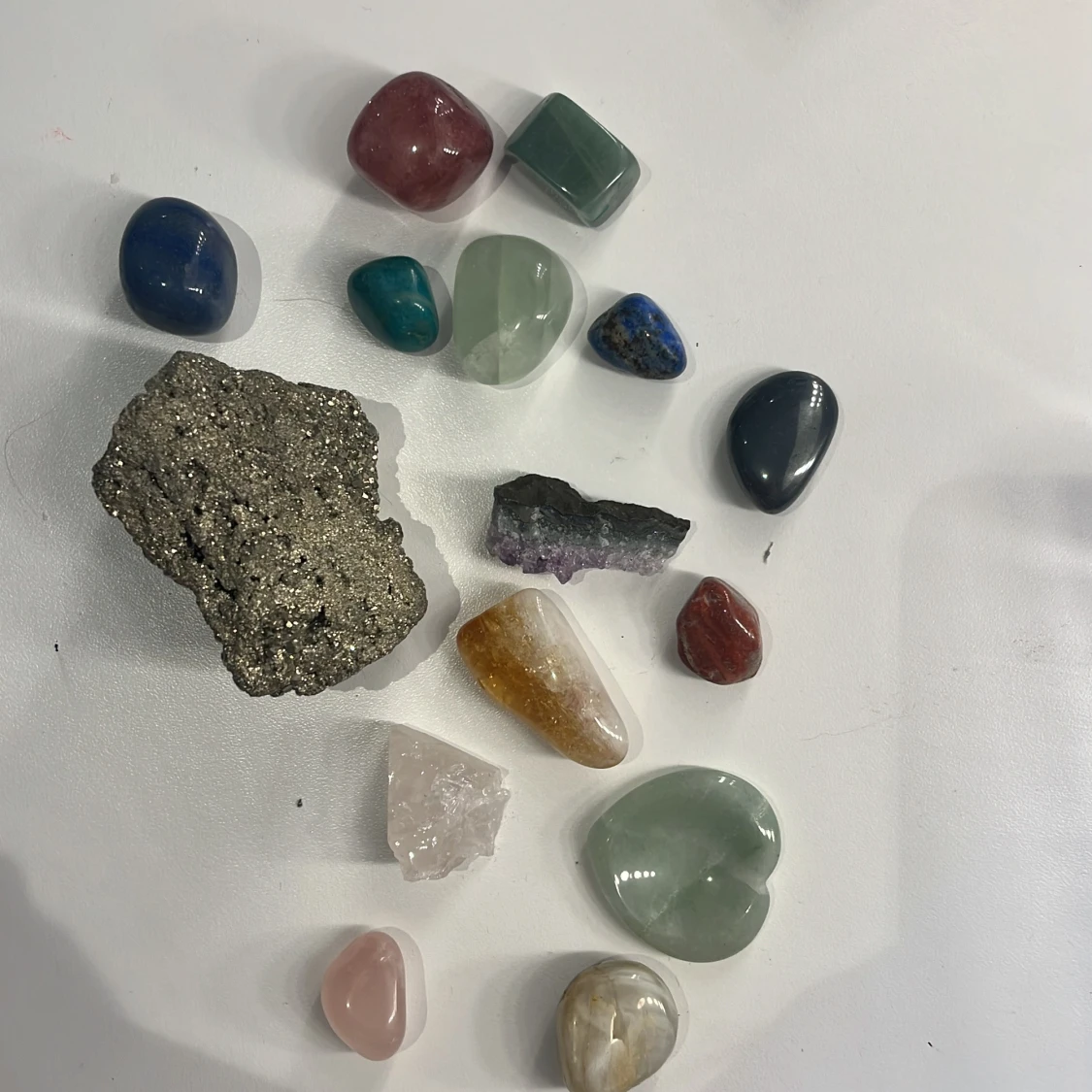 Olika kristaller (Ă€kta). Den största, pyriten Ă€r dyrast och ligger pĂ„ 220. Hör av er vid intresse! Vi kommer fram till ett pris för de andra đ