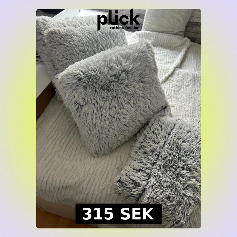 Bilderna visar ett set med fluffiga grå prydnadskuddar och en matchande pläd. Kuddarna har lång, mjuk lugg och pläden har en slät baksida. Allt ser ut att vara i mycket gott skick utan synligt slitage eller fläckar. Perfekt för att skapa en mysig känsla i soffan eller sovrummet.
