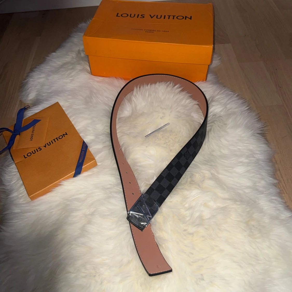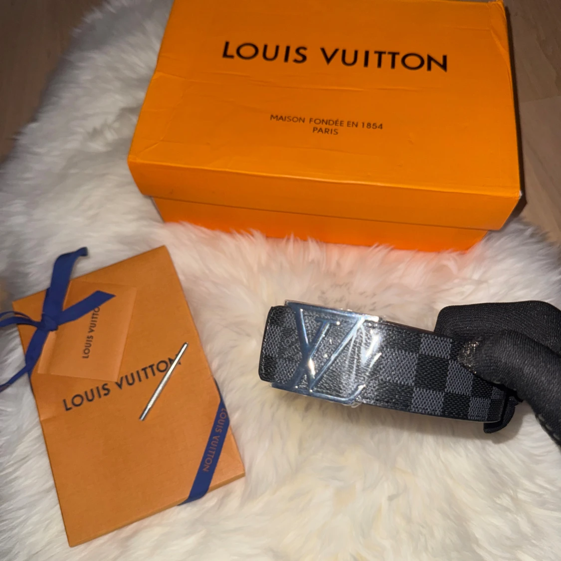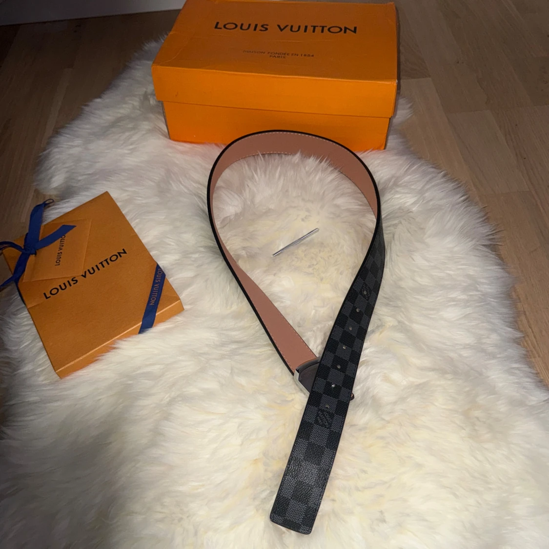 Snyggt L och V bälte i svart och grått med klassiskt rutigt Damier-mönster. Bältet har en silverfärgad L och V-spänne och är gjort i exklusivt skinn. Perfekt accessoar för att lyfta din outfit med en lyxig touch. Box medkommer ej