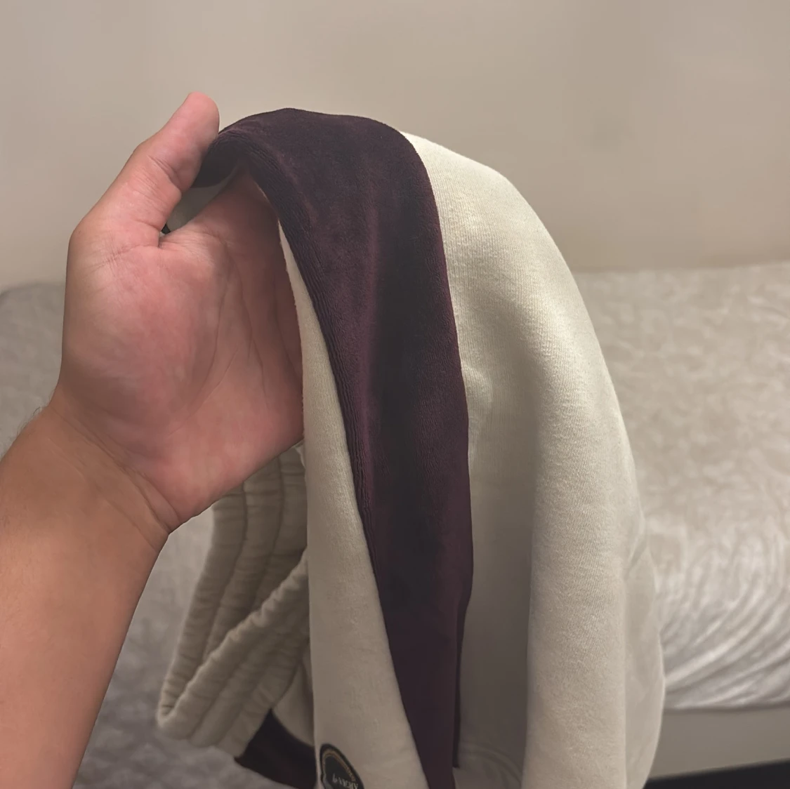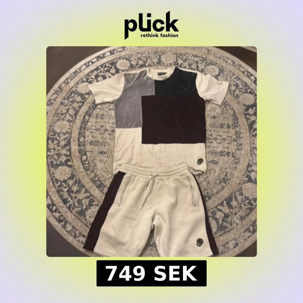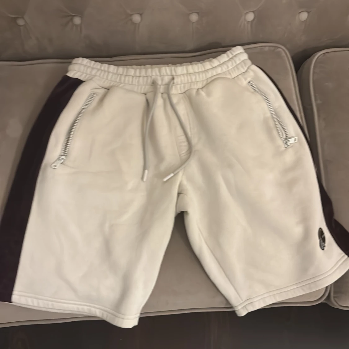 Snygga beige shorts och t shirt från LAvichy med breda vinröda sammetspaneler längs sidorna på shortsen, och i mitten på t shirten. De har elastisk midja med snörning och två dragkedjeförsedda fickor. Materialet är mjukt och har en lyxig känsla, perfekt för chill dagar. Patch med logga på benet.