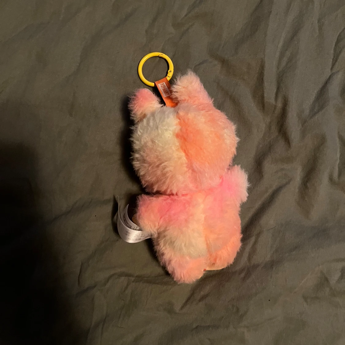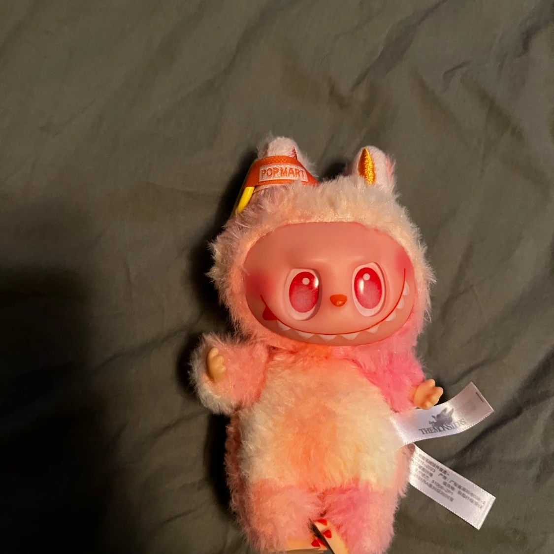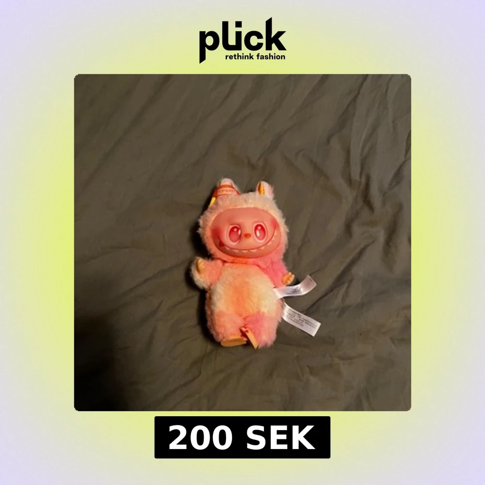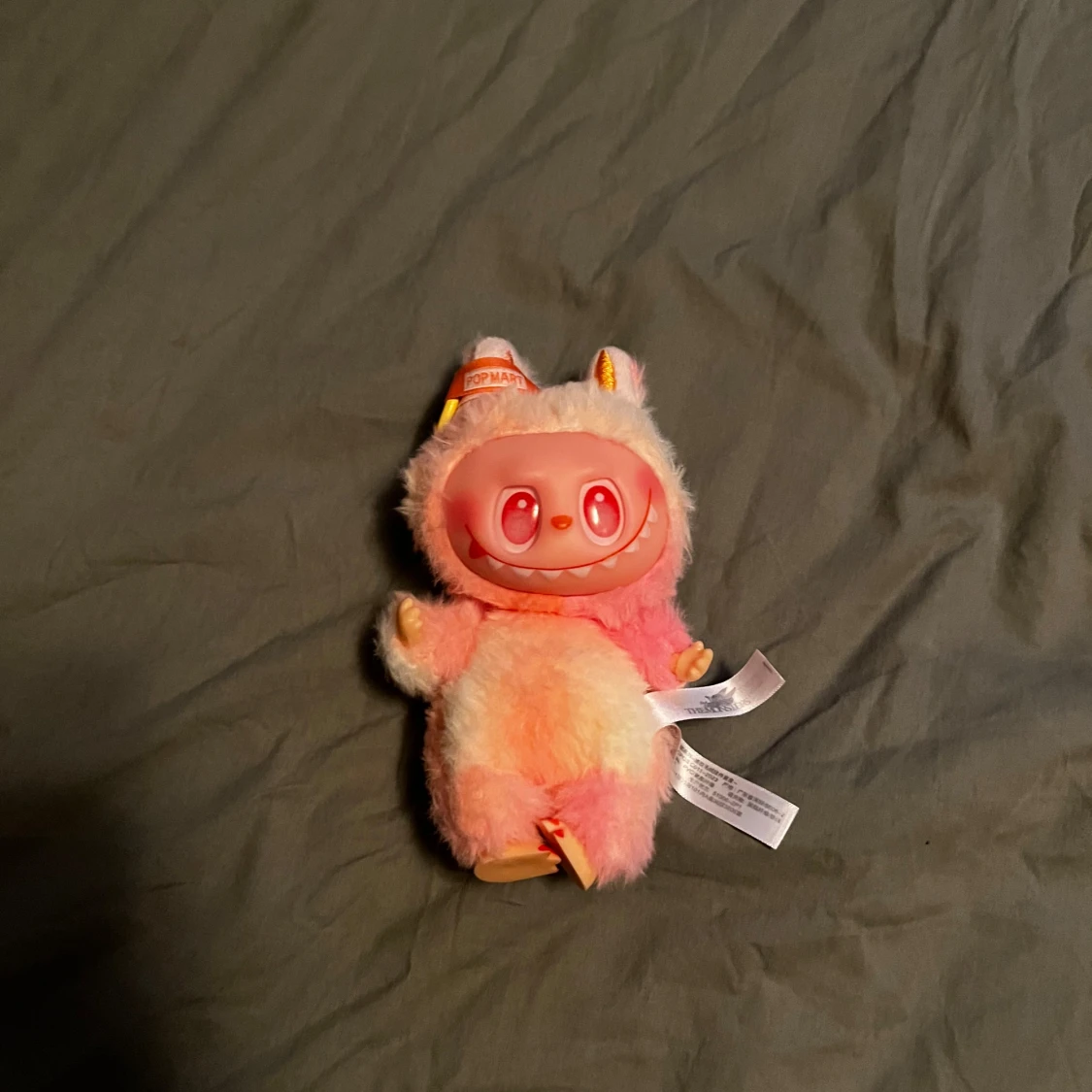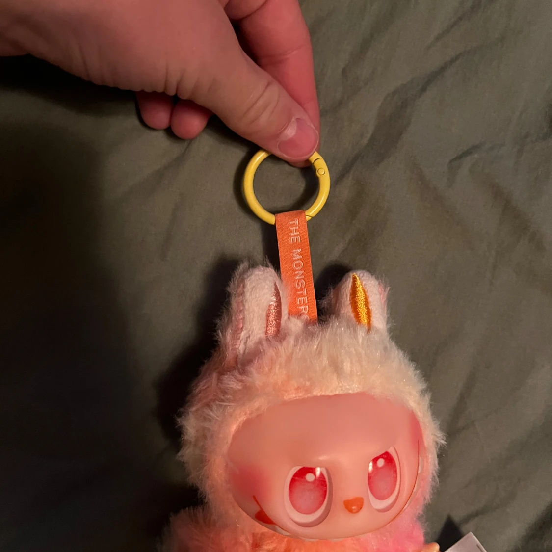 Bilderna visar en Pop Mart THE MONSTERS nyckelring/figur i plysch och plast, med rosa och vita färger. Produkten är i mycket fint skick utan synligt slitage. Perfekt som samlarobjekt eller accessoar. Söt design med stora ögon och ett glatt leende.