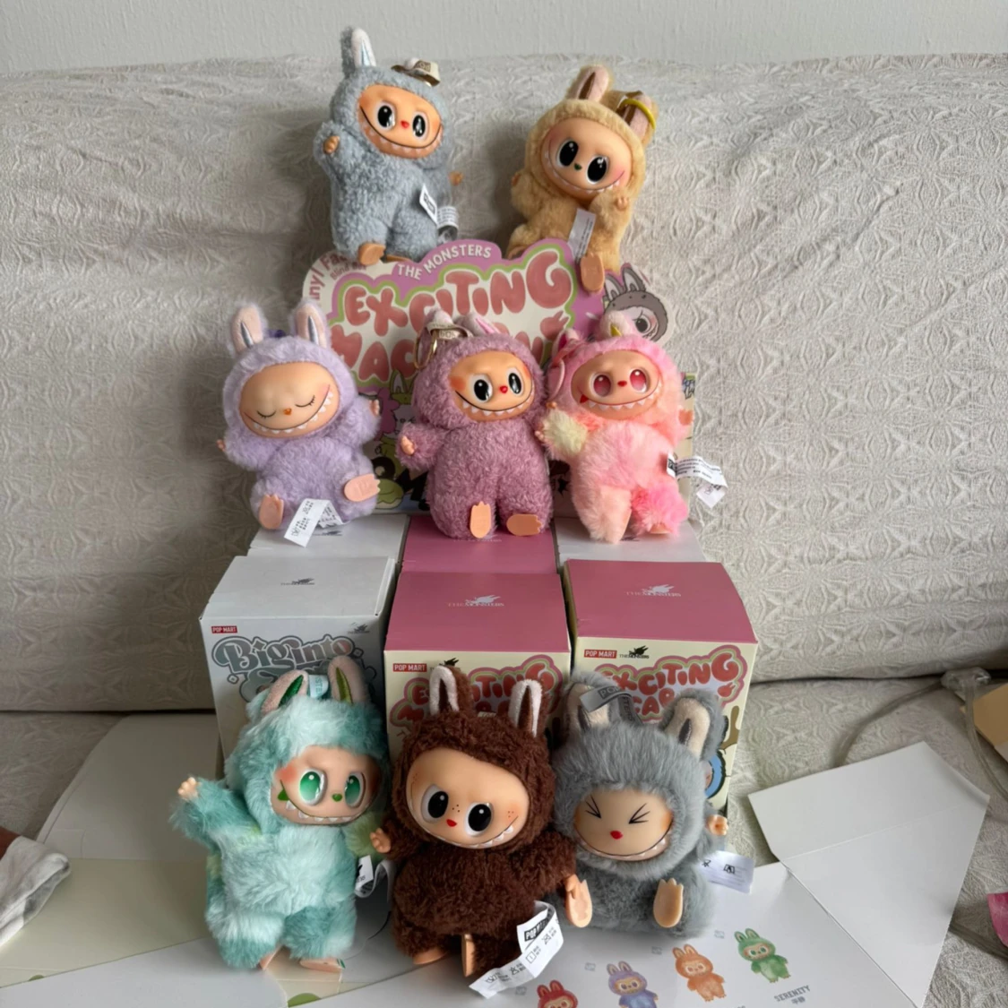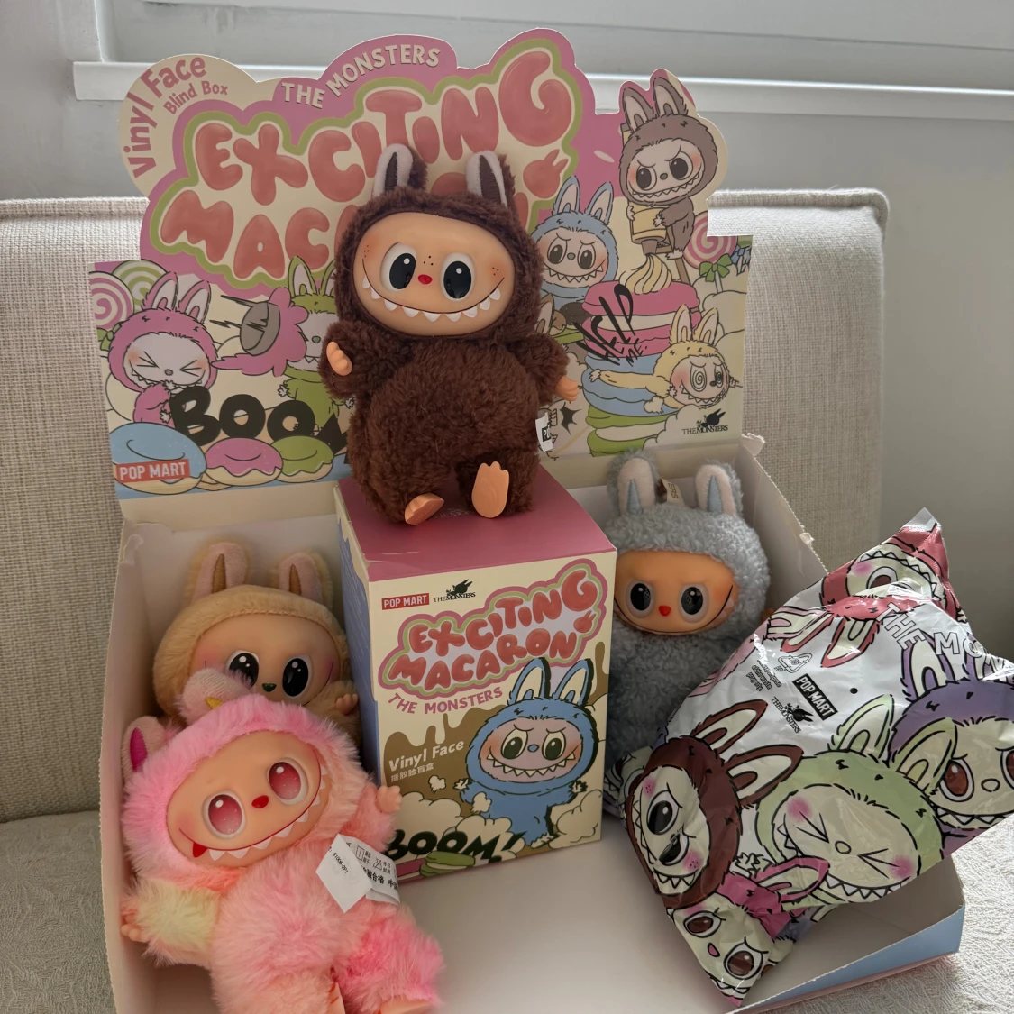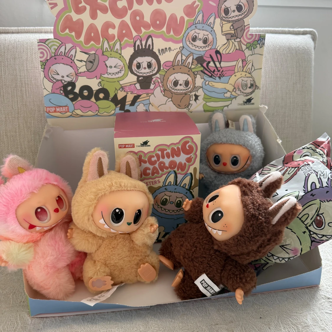 Labubus i 3 olika versioner 🧸 Big into energy Have a seat Macaron Skriv gärna vilken ni föredrar vid köp Låda och påse följer med, 100kr/st vid köp av fler får man billigare. Vill ni köpa en öppnad finns dom på bilderna!