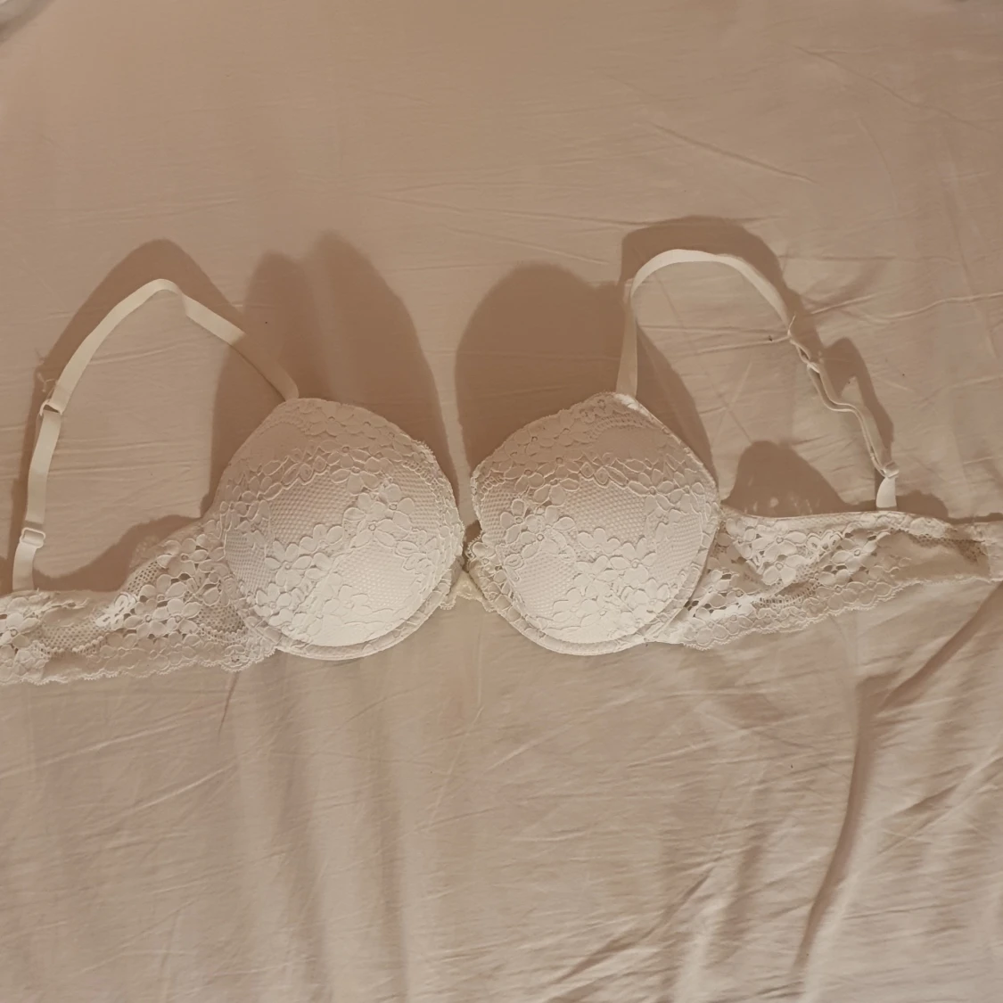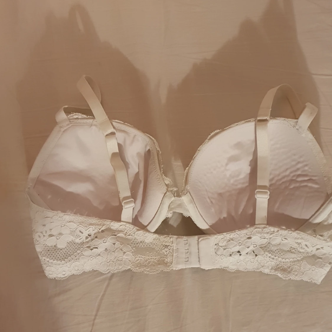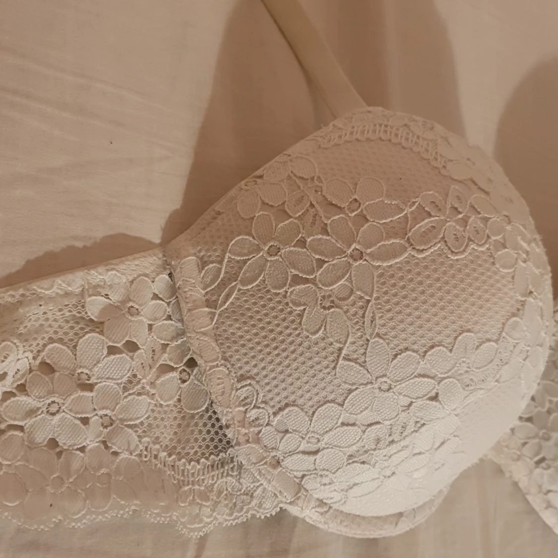 Vit spetsbh med lätt vaddering spet av blommor. Väldigt söt. Använd fåtal ggr. Inga noppror slitni gar och den är riktigt vit. Tre hyskor bak i knäppet. Skriv om du undrar vadsom 🙂 Pris 80kr
