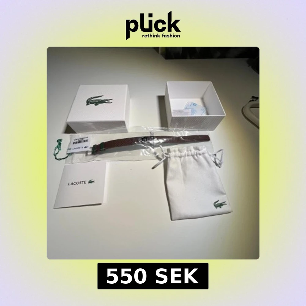 Snyggt brunt armband från Lacoste i äkta skinn med texturerad yta och silverfärgad krokodillogga framtill. Armbandet har klassisk form och levereras med original ask och tygpåse med Lacoste-logga. Min handled är 17cm omkrets och armbandet passar perfekt på mig om man har den i sista hålet. Perfekt för dig som gillar stilrena accessoarer med premiumkänsla.