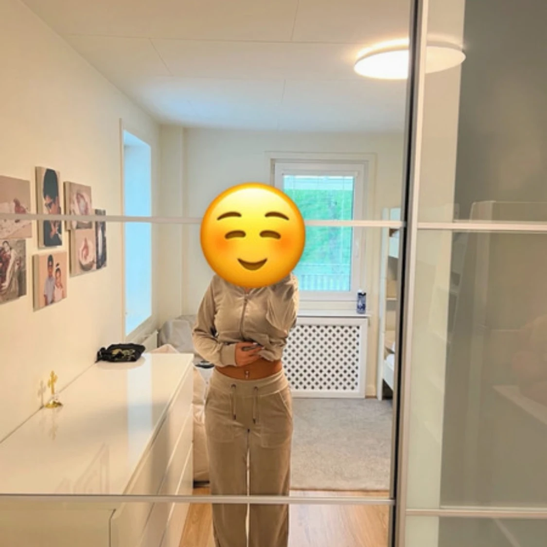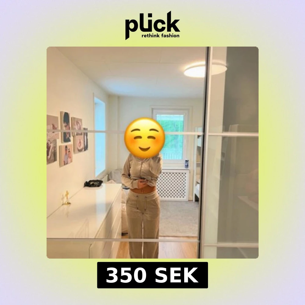 Säljer ett par beige mjukisbyxor och kofta i mjuk velour med bred resår och snörning i midjan. Byxorna har raka ben, stora fickor framtill och en chill loose passform. Perfekta för en avslappnad stil och superbekväma att ha på sig.