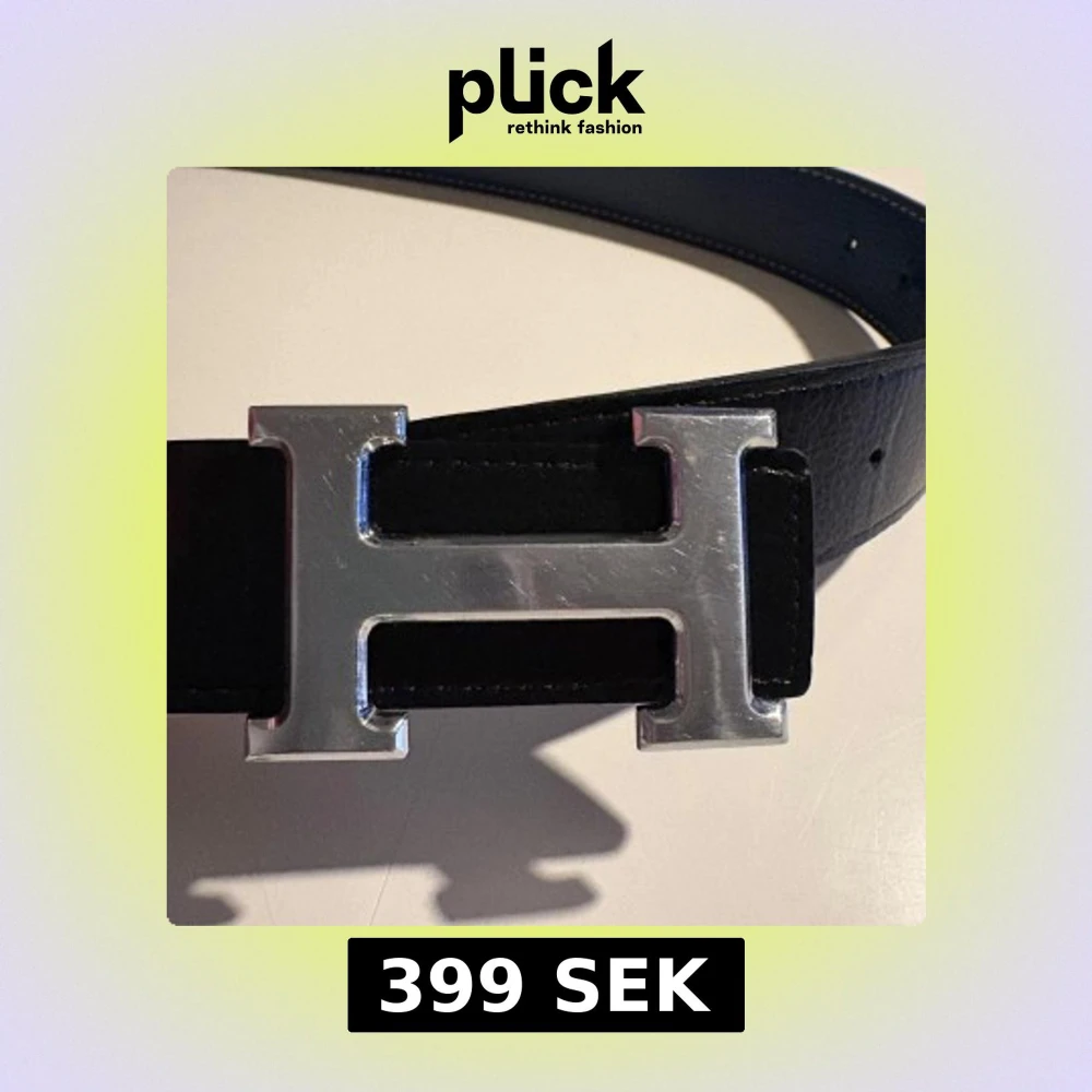Säljer ett stilrent svart bälte med ett stort, silverfärgat H-spänne. Bältet är gjort i skinn och har en klassisk design som passar till många olika outfits. Perfekt accessoar för dig som gillar exklusiva detaljer. Kan vara svart och blått.