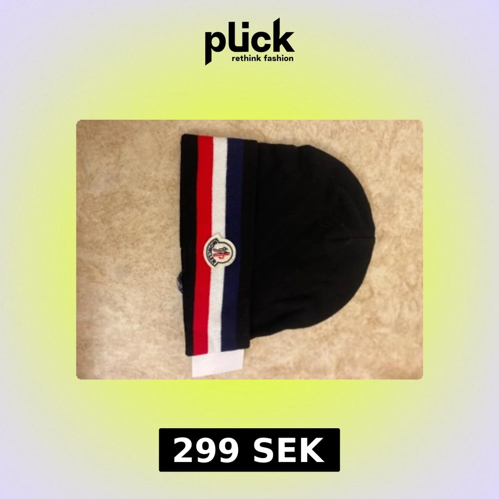 Snygg svart mössa från Moncler med breda randiga detaljer i rött, vitt och marinblått. Framtill sitter Monclers klassiska broderade logotyp. Mössan är stickad och har en mjuk, skön känsla som passar perfekt när det är kallt ute.