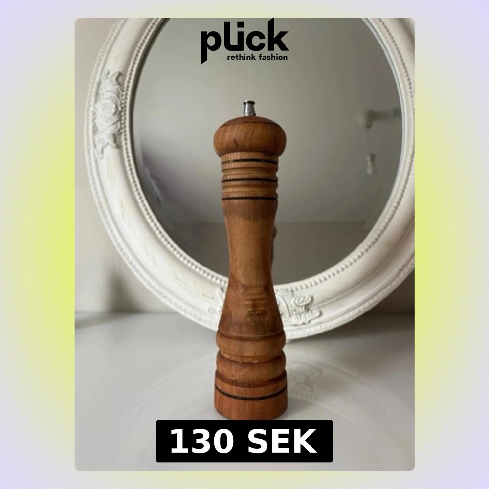 Säljer en stilren pepparkvarn i brunt trä med svarvade detaljer och metallknopp på toppen. Kvarnen har en elegant, avsmalnande form och svarta dekorlinjer. Perfekt för att mala peppar direkt över maten.