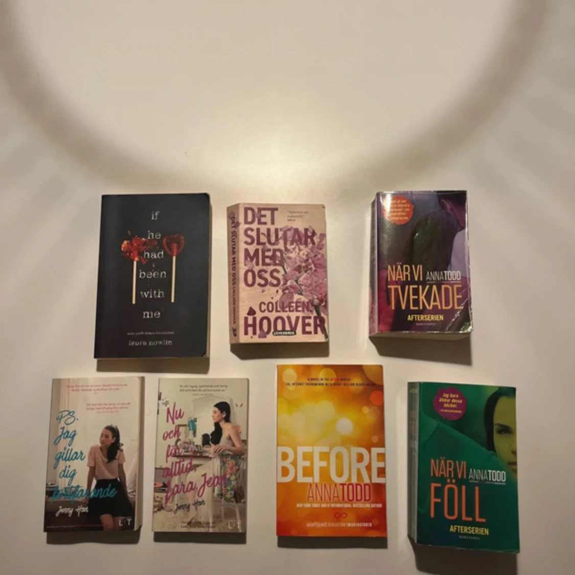 Säljer blandade böcker! Alla är i bra skick, några vikta kanter här och där men rena och fina annars. 300kr för alla! 50kr/styck If he had been with me (engelska)- Laura Norlin Det slutar med oss (svenska) - Colleen Hoover När vi tvekade (svenska) - Anna Todd Ps Jag gillar dig forfarande (svenska) - Jenny Han Nu och för alltid, Lara Jean (svenska) - Jenny Han Before (engelska) - Colleen Hoover När vi föll (svenska) - Anna Todd För evigt (svenska) - Anna Todd
