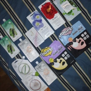 19 sheet masks och ansiktsmasker, två Clarins makeup remover, Hope 5a control emulsion Leegeeham, Glow hub nourish & hydrate serum mist. Mist är provad två gånger, clarins nya, maskerna nya, Hope 5a control emulsion Leegeeham oanvänd. Alla för 369 kr.
