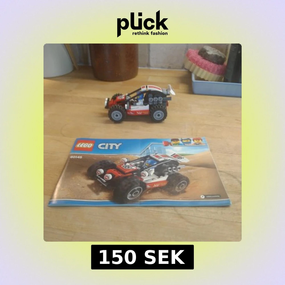 Bygginstruktioner till LEGO City set 60145 Buggy. Instruktionshäftet har färgglad framsida med bild på en röd och vit buggybil med stora däck och racingdetaljer. Perfekt för dig som vill bygga eller komplettera din LEGO-samling. Kartongen saknas.