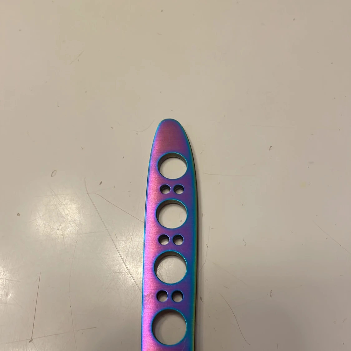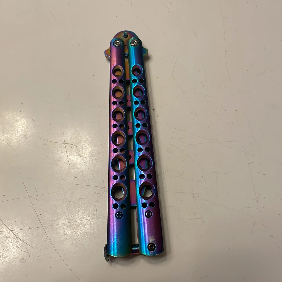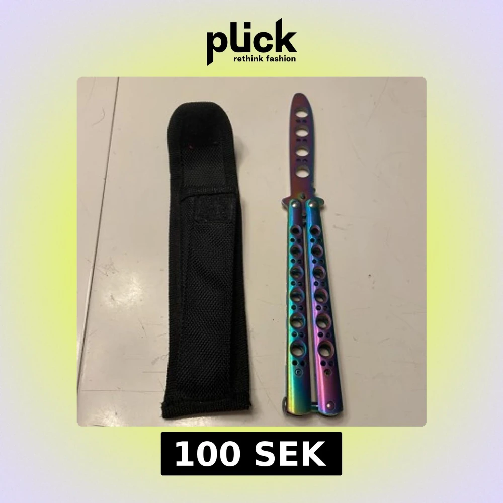 Butterfly är gjord av rostfrittstål vilket ger den både hållbarhet och lätt vikt.Bladet är inte vasst vilket gör den bra till att öva tricks med!Det finns ett svart nylonfodral till för förvaring och skydd.Butterflyen har en regnbågsskiftande färg som gör den unik!