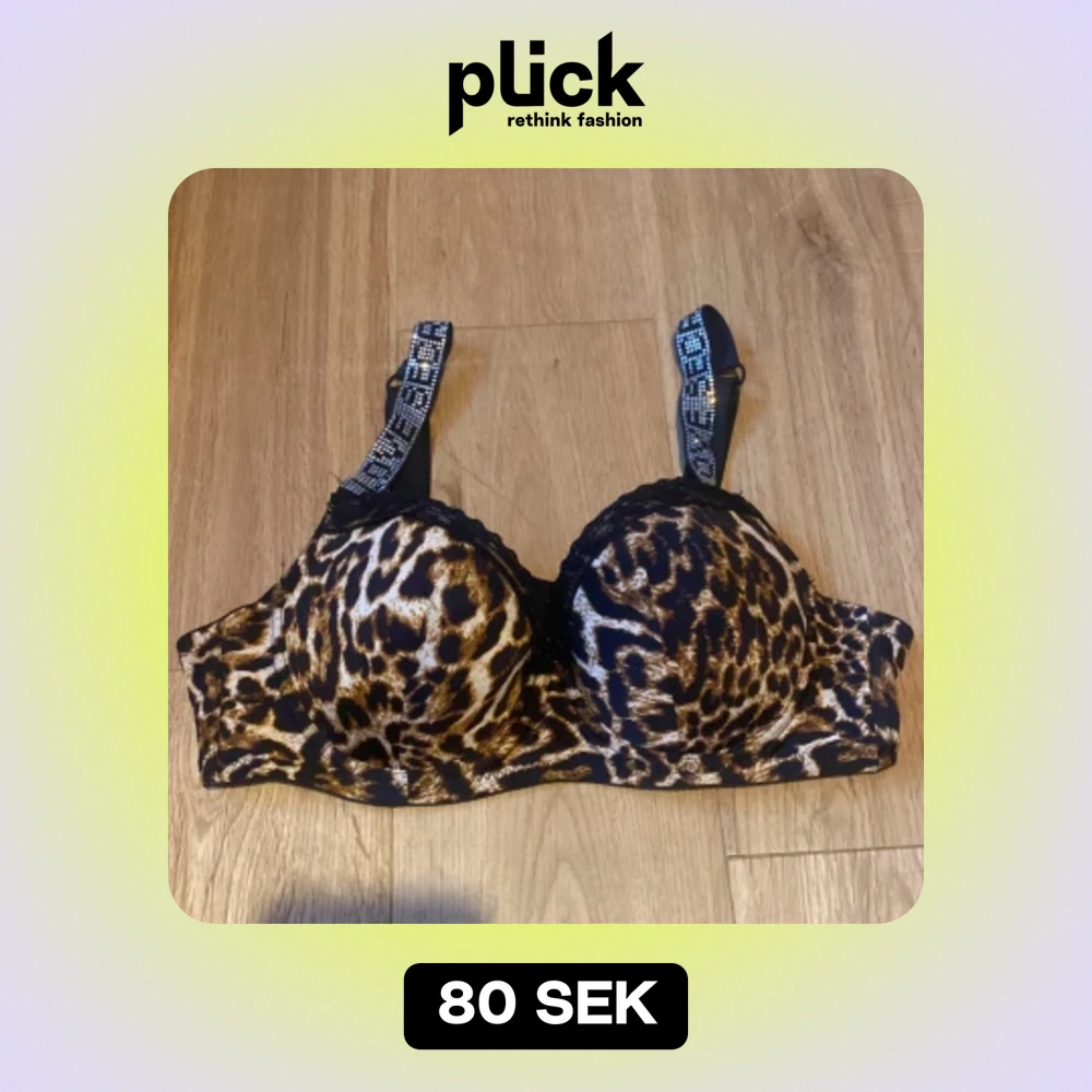 Säljer en snygg leopardmönstrad bh med glittriga axelband.. Den är knappt använd och har en fin spetsdetalj vid kuporna. Axelbanden är justerbara och bh:n stängs med hyskor i ryggen.
