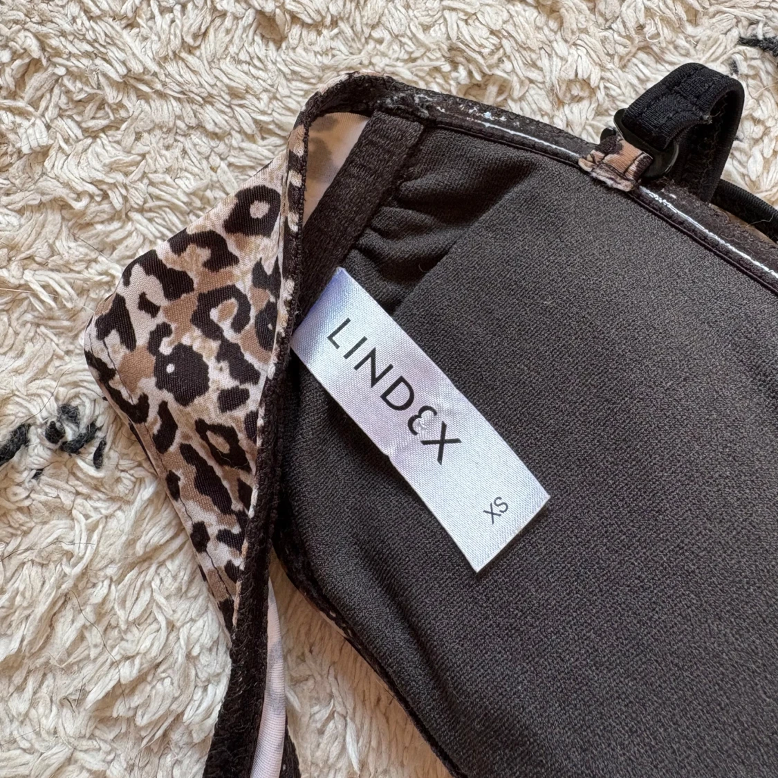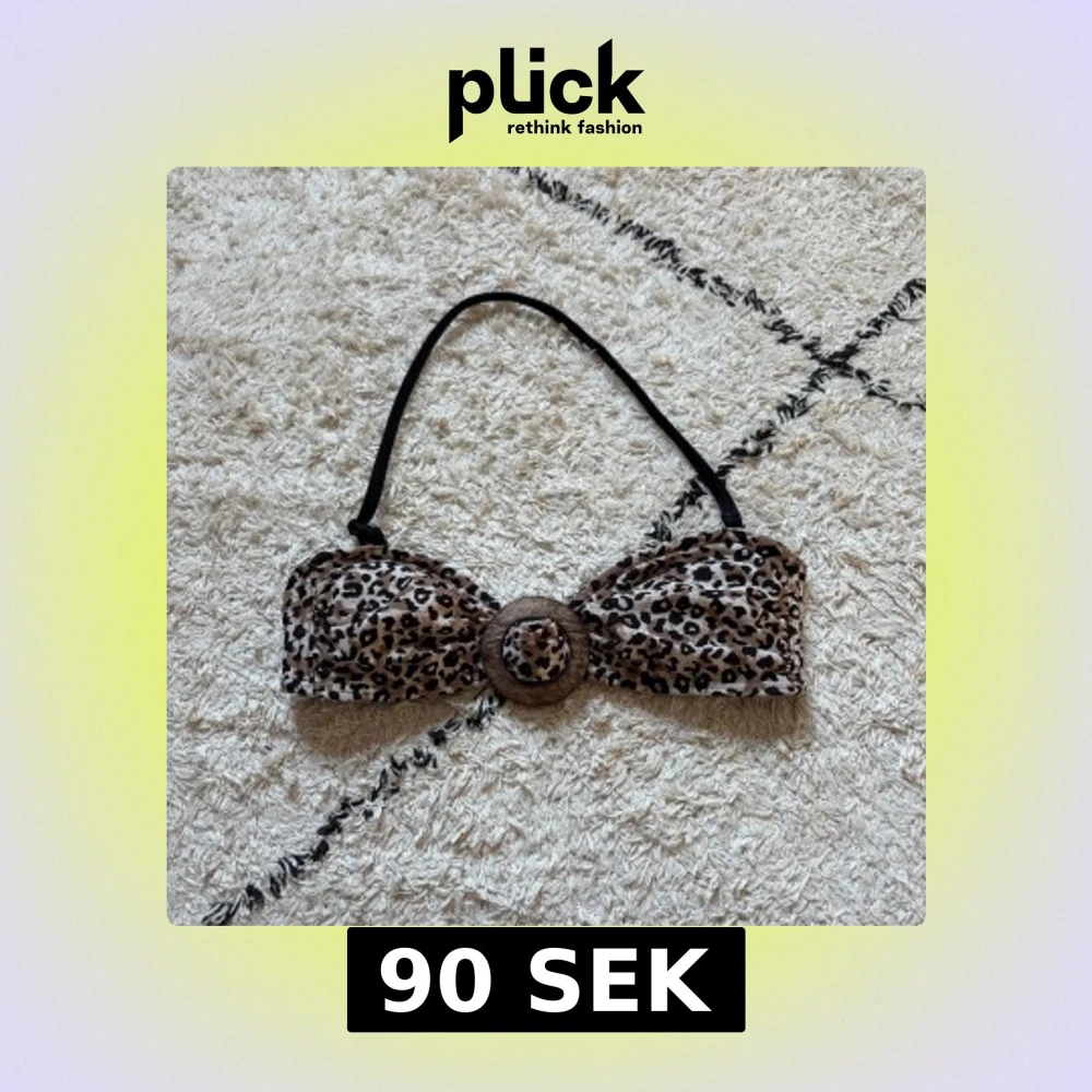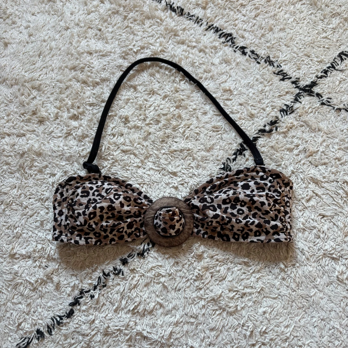 Snygg bikiniöverdel från Lindex i leopardmönster med bruna och svarta toner. Bandeau-modell med avtagbar axelrem och coolt träinspirerat spänne framtill. Perfekt för strandhäng och poolparty.