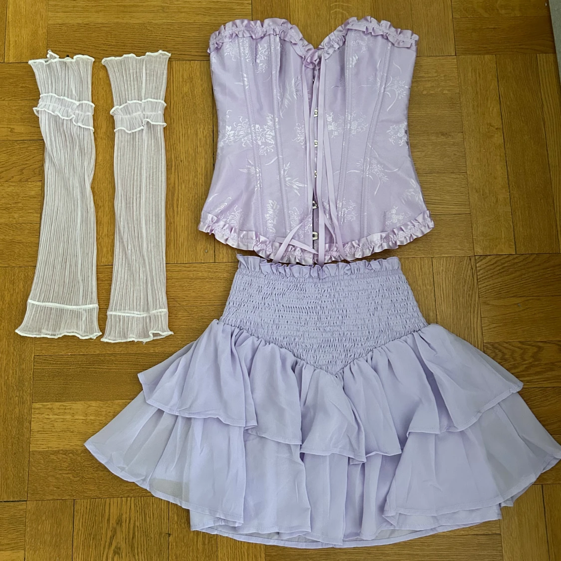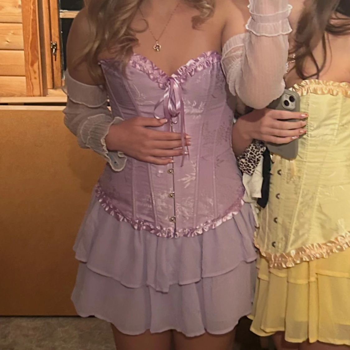 Säljer min Rapunzel kostym från förra året, korsett, kjol, arm volanger och även ett par guldiga örhängen med lila diamanter på hela och ett halsband som är rapunzels blomma och blommor med hårknäpen (både små och två större blommor). Super bra skick, bara använd en gång. Korsetten är i storlek xs men går att skysteta som man vill och kjolen är i xs men är också väldigt töjbar💞💞