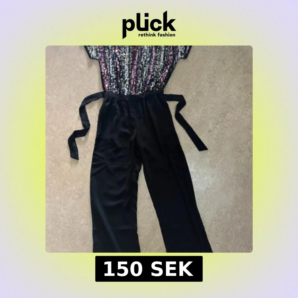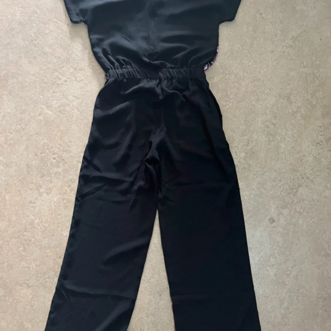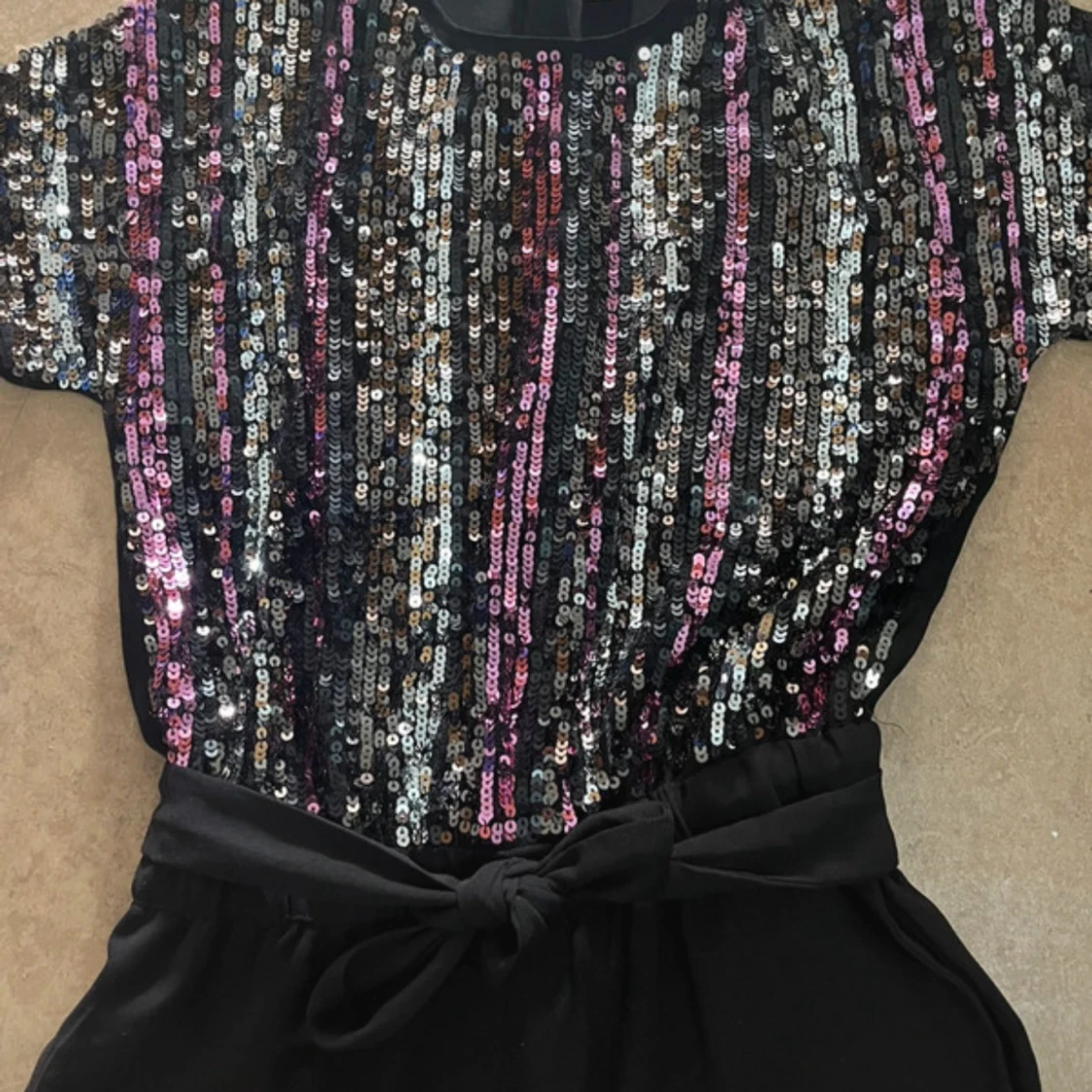 Snygg svart byxdress med vida ben och knytband i midjan. Överdelen är täckt av glittriga paljetter i svart, silver och rosa för en extra festlig look. Byxorna är raka och tillverkade i ett mjukt tyg som ger en skön känsla.