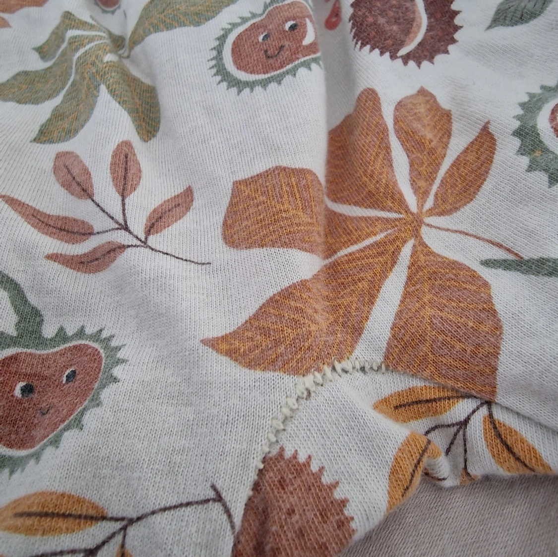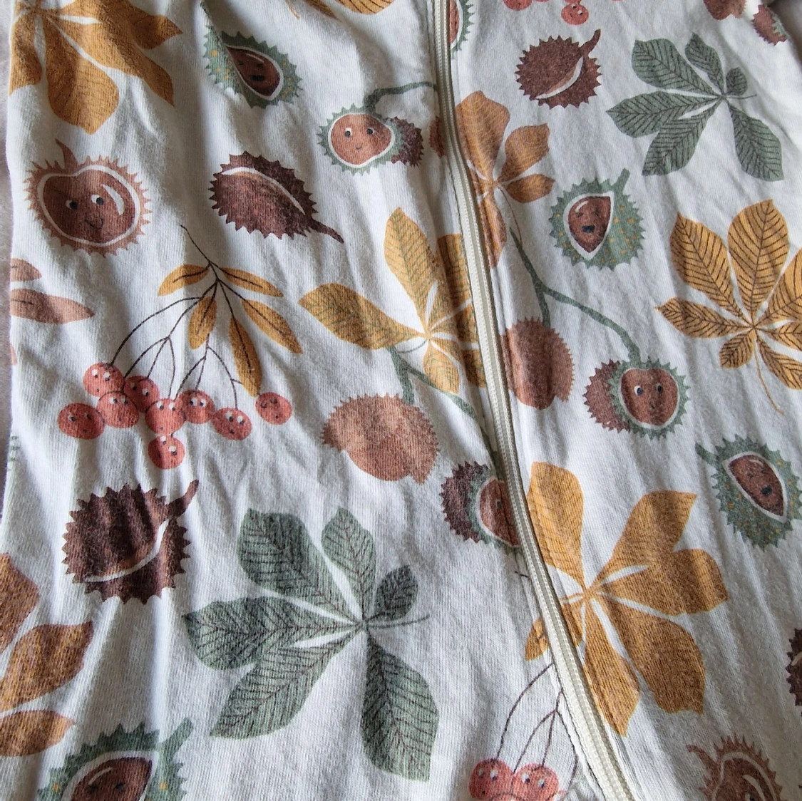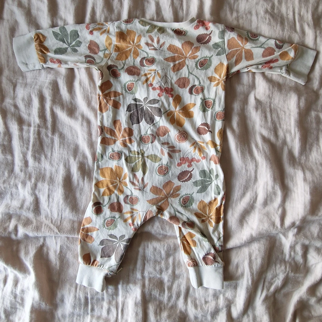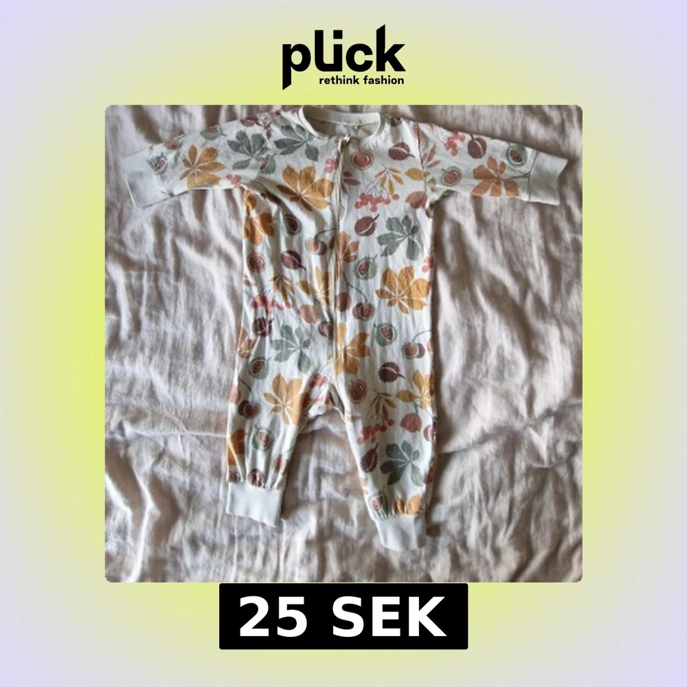 Mysig pyjamas med långa ärmar och ben, hel dragkedja framtill och ribbade muddar. Tyg i mjuk bomull med höstigt mönster av löv och bär i bruna, gröna och gula toner på vit botten. Pyjamasen har varit en favorit och färgen är därför tvättpåverkad. Dragkedjan kärvar lite men funkar bra och stygnen vid rumpan är inte trasiga men lite utdragna vilket jag upplever att de flesta pyjamasar från Lindex blir.