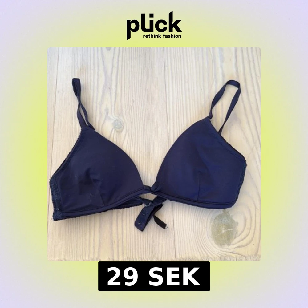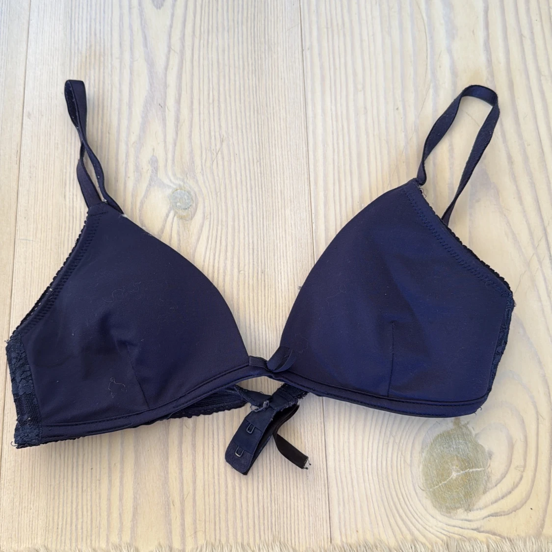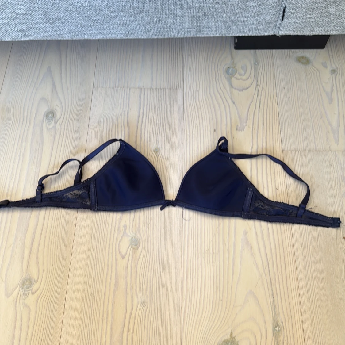 Snygg mörkblå bhöverdel från Lindex med trekantsformade kupor och justerbara axelband. Sidorna har spetsdetaljer och framtill finns en liten rosett. Stängs med hakar i ryggen.