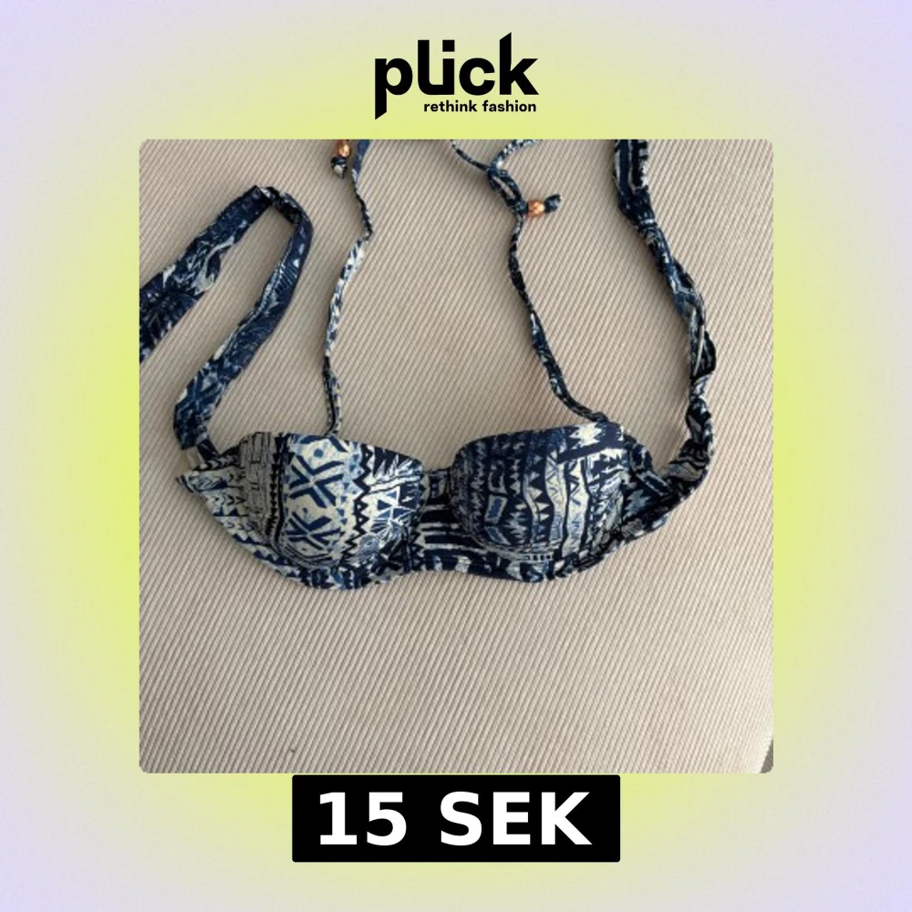 Bikiniöverdel med ett mönster i blått och vitt. Den har knytband med dekorativa pärlor och vadderade kupor.