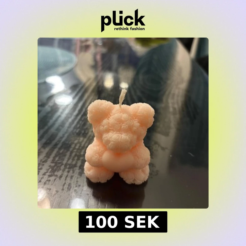 Tillverkar egna ljus som jag sedan säljer vidare, tillverkar flera olika sorts. Bilderna visar ett ljus format som en söt nallebjörn, dekorerad med små rosor och ett hjärta. Ljusets färg är ljusrosa och det har en tydlig veke på toppen.