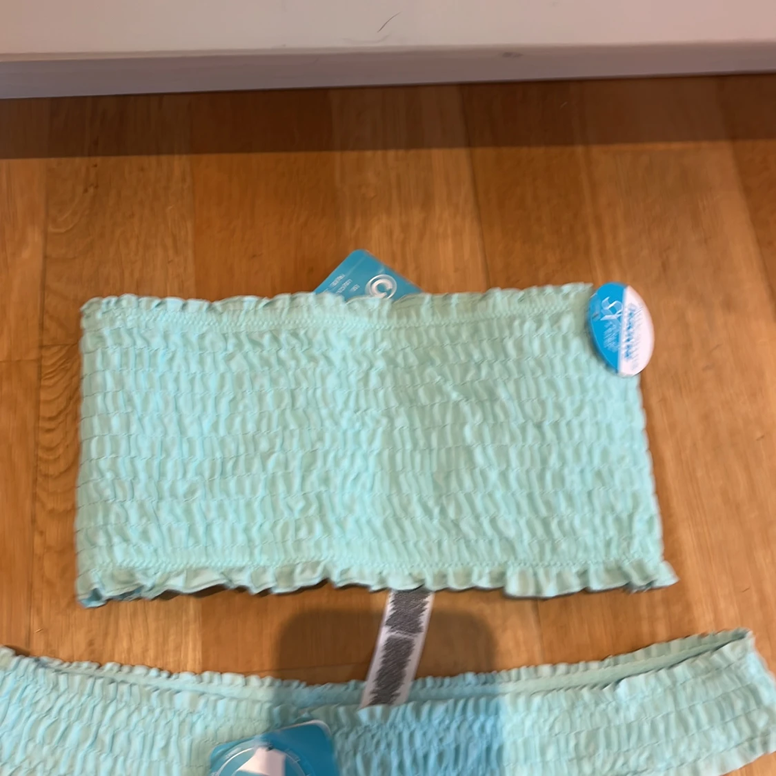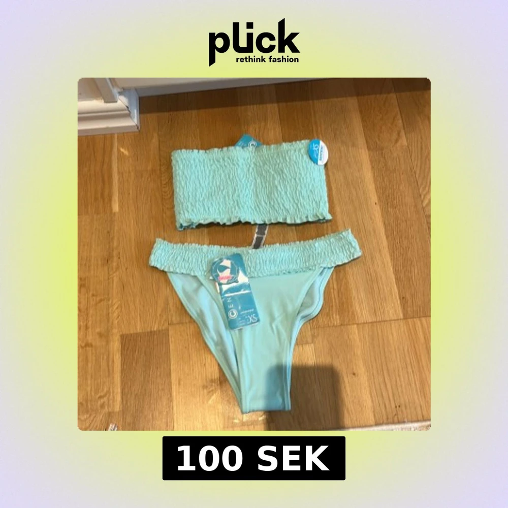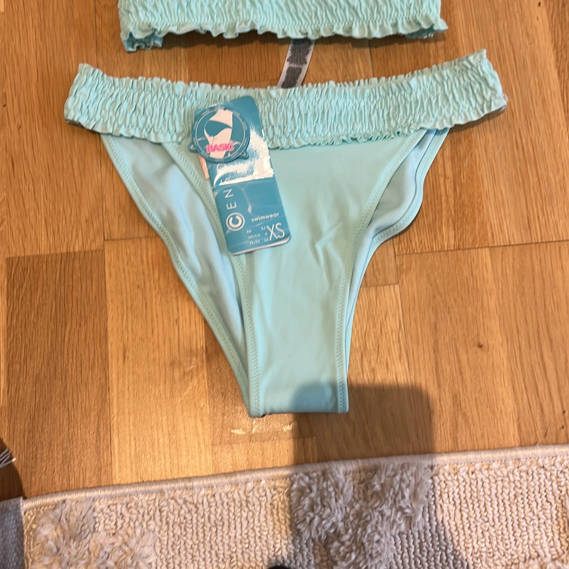 Trendig ljusblå bikini med bandeau-topp. Båda delarna har detaljer upptill. Man får även med armar till överdelen som är bortagsbara. Bekväm passform. Perfekt för strand eller poolhäng. Materialet känns mjukt och stretchigt. Helt ny och helt oanvänd. Storlek XS