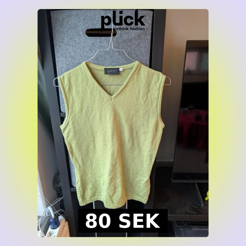 Snygg ljusgrön stickad väst från Gianini i storlek M. Västen har en klassisk v-ringad hals och ribbade kanter vid ärmhål och hals. Perfekt att styla över en t-shirt eller skjorta för en chill och trendig look.