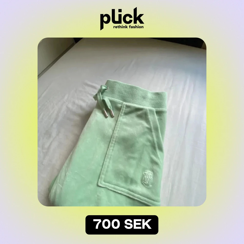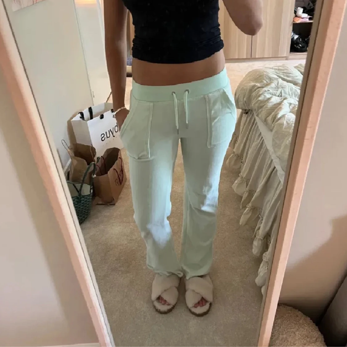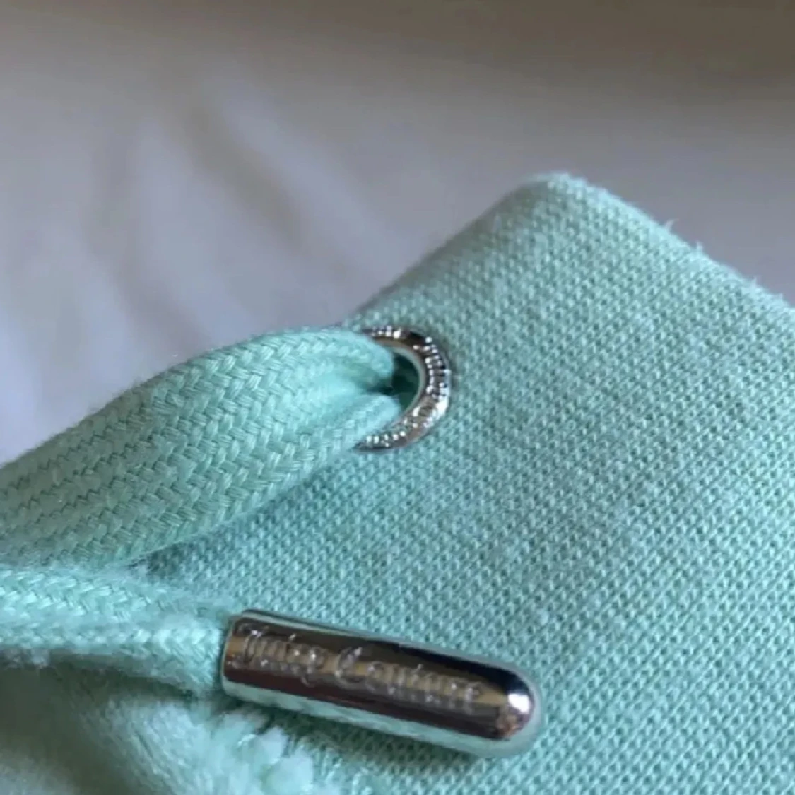 Säljer ett set med en mintgrön juicy hoodie och matchande byxor. Hoodien har dragkedja och långa ärmar, perfekt för en avslappnad stil. Byxorna har en bekväm passform med snörning i midjan och praktiska fickor. Supermysigt och trendigt för chill dagar hemma eller ute.