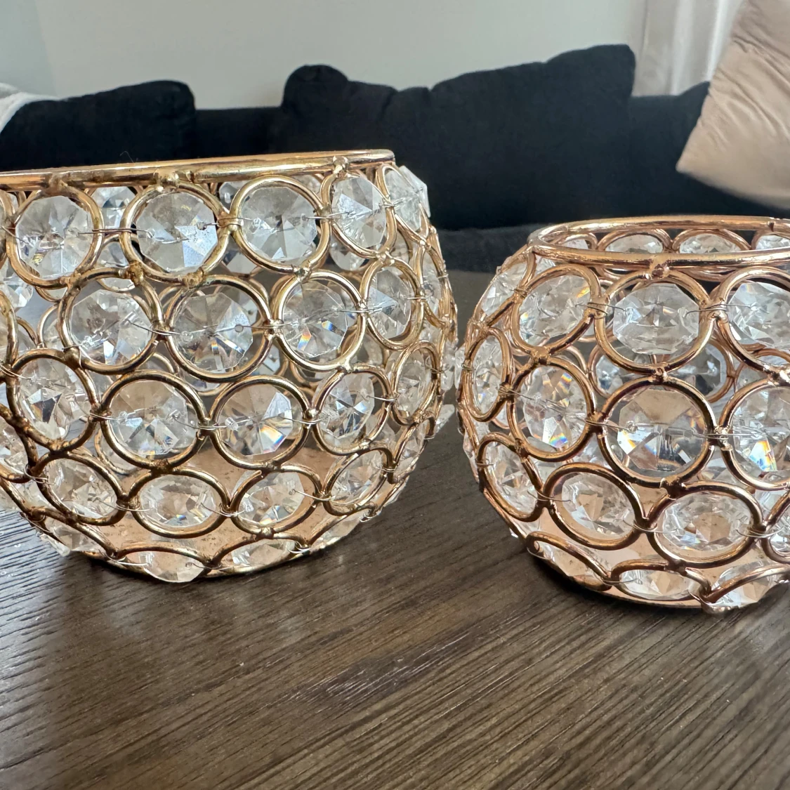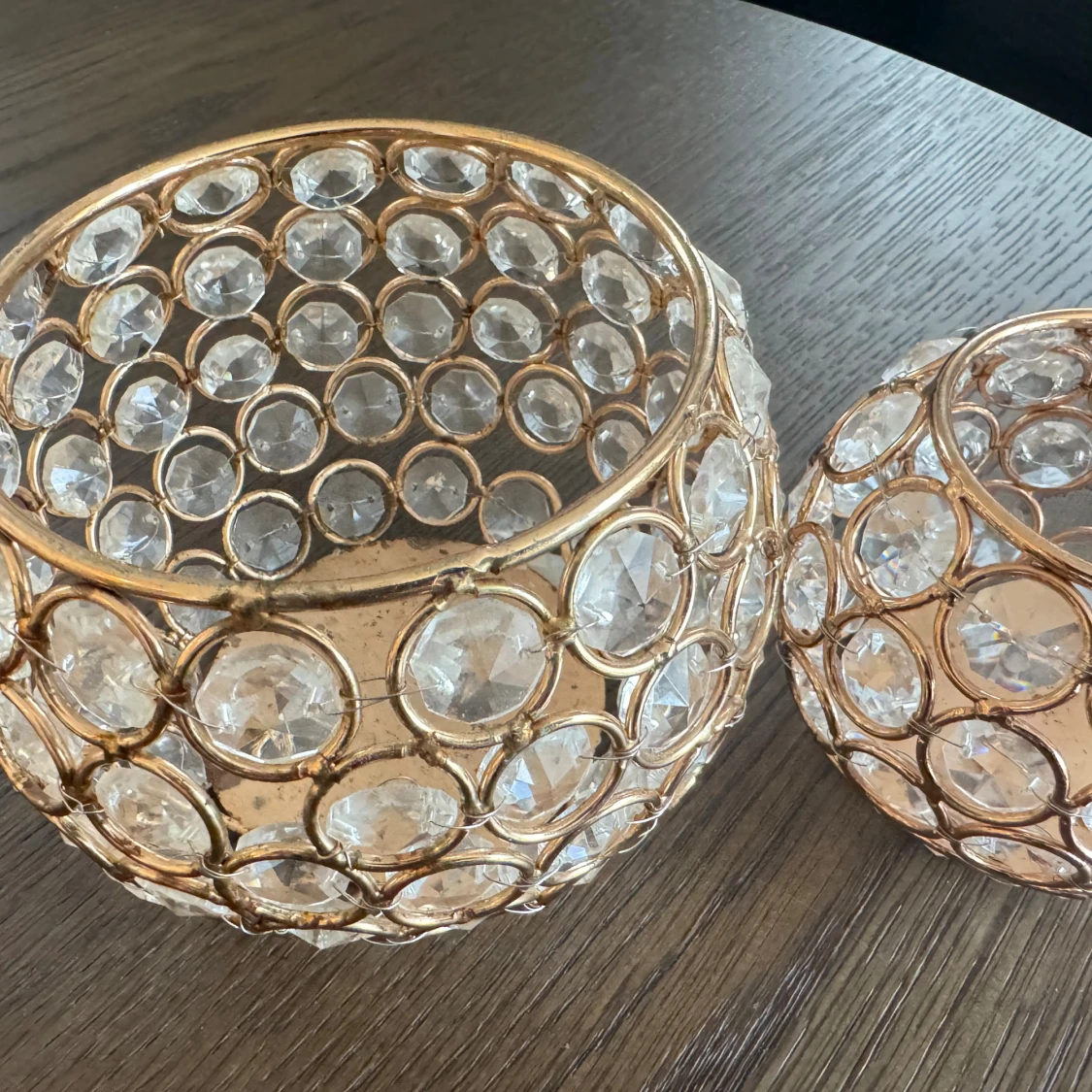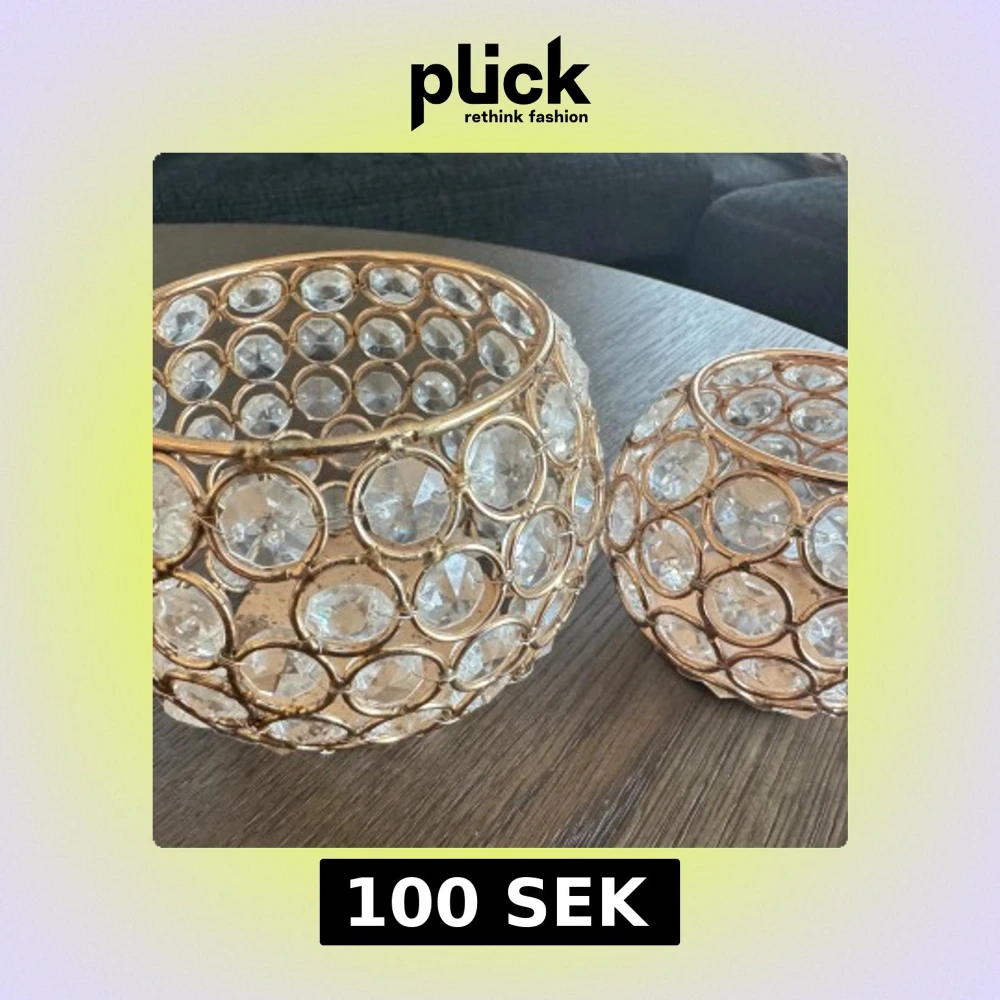 Två dekorativa ljuslyktor i guldmetall med infattade klara kristaller. Ger ett elegant och lyxigt intryck, perfekta som bordsdekoration eller för mysig belysning. Mindre spår av användning syns på metallen, men i gott skick. Säljes som par.