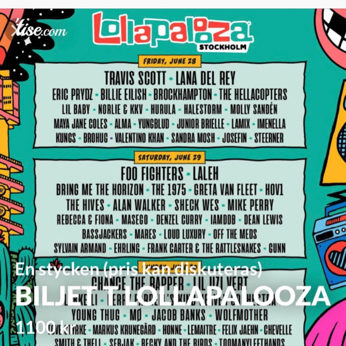 Biljett till lollapalooza, säljes pga brutet ben. Gäller alla 3 dagar! orginalpris 1800kr