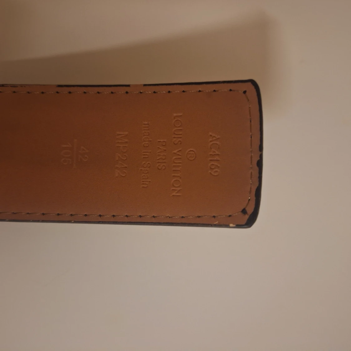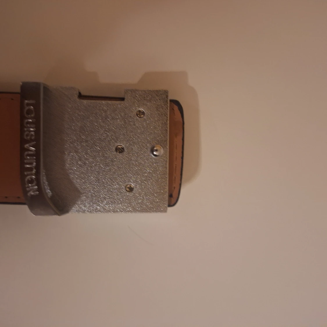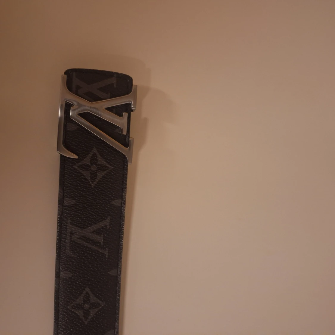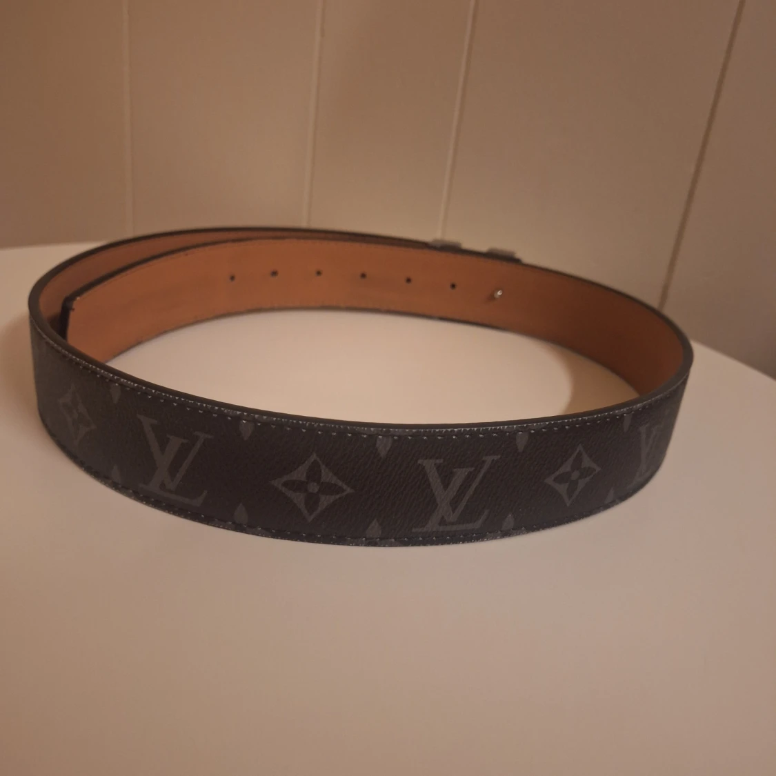 Svart skinnbälte från Louis Vuitton med klassiskt monogrammönster och stor LV-spänne i silver. Bältet har en stilren och exklusiv look med mörka toner och detaljerad präglad insida. Perfekt för dig som vill ha en lyxig accessoar med tydlig designerstil.