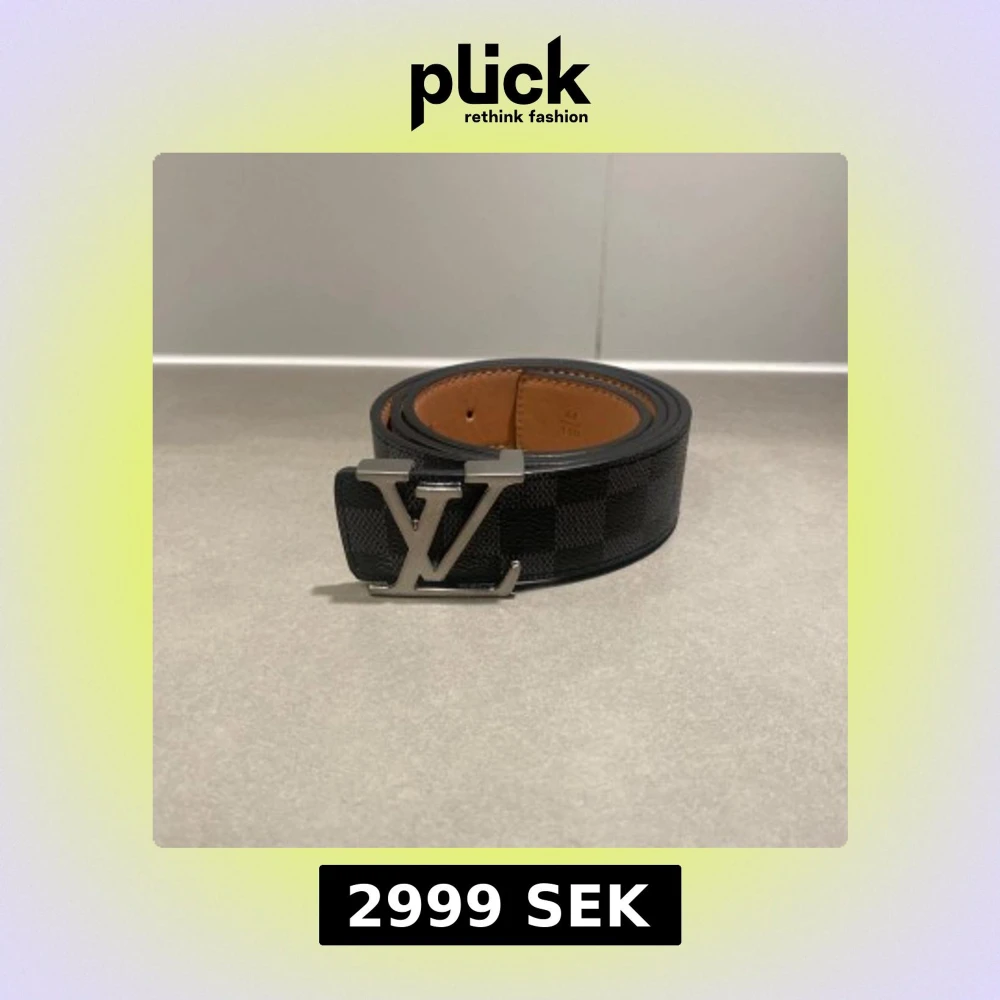 Snyggt Louis Vuitton bälte i svart och grått med klassiskt rutigt Damier Graphite-mönster. Bältet har en stor silverfärgad LV-logga som spänne och är gjort i exklusivt skinn med brun insida. Perfekt accessoar för att lyfta din outfit.