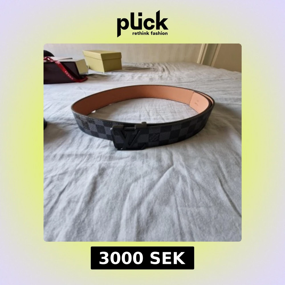 Snyggt Louis Vuitton-bälte i klassiskt Damier-mönster med svart och grå ruta. Bältet har en mattsvart LV-logga som spänne och är gjort i exklusivt skinn med ljusbrun insida. Perfekt accessoar för att lyfta din outfit med en lyxig touch.