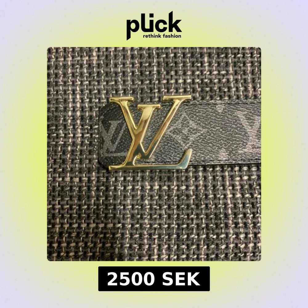 Svart Louis Vuitton skärp i skinn med klassiskt monogrammönster och stor LV-logga i guldmetall som spänne. Bältet har exklusiv känsla och tydliga detaljer, perfekt för dig som vill sticka ut med en ikonisk accessoar.