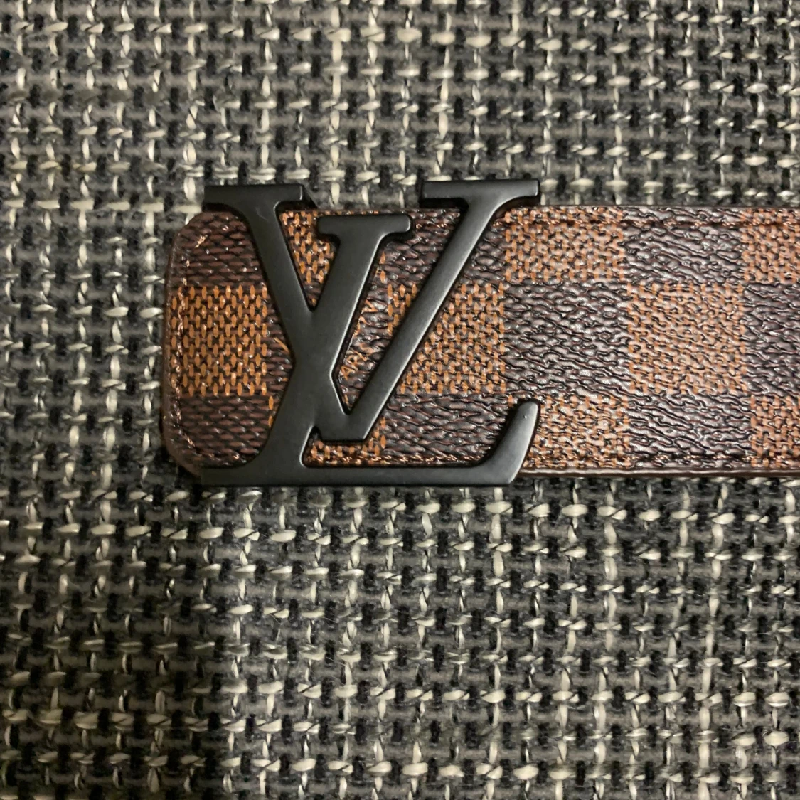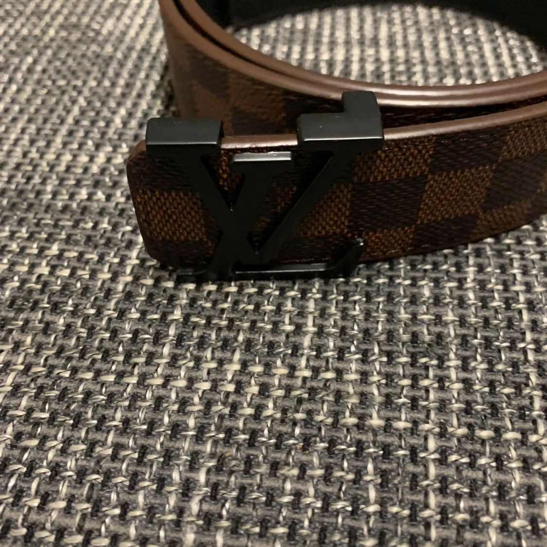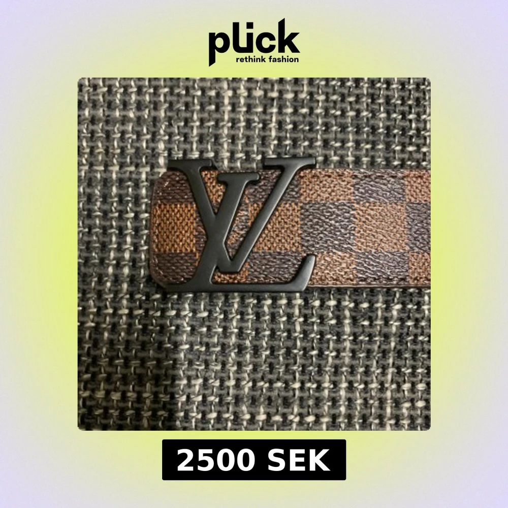 Säljer ett Louis Vuitton bälte i klassiskt brunt och mörkbrunt rutigt mönster med stor LV-logga i svart metall framtill. Bältet är gjort i äkta skinn och har exklusiv känsla, perfekt för dig som vill sticka ut med en ikonisk accessoar.