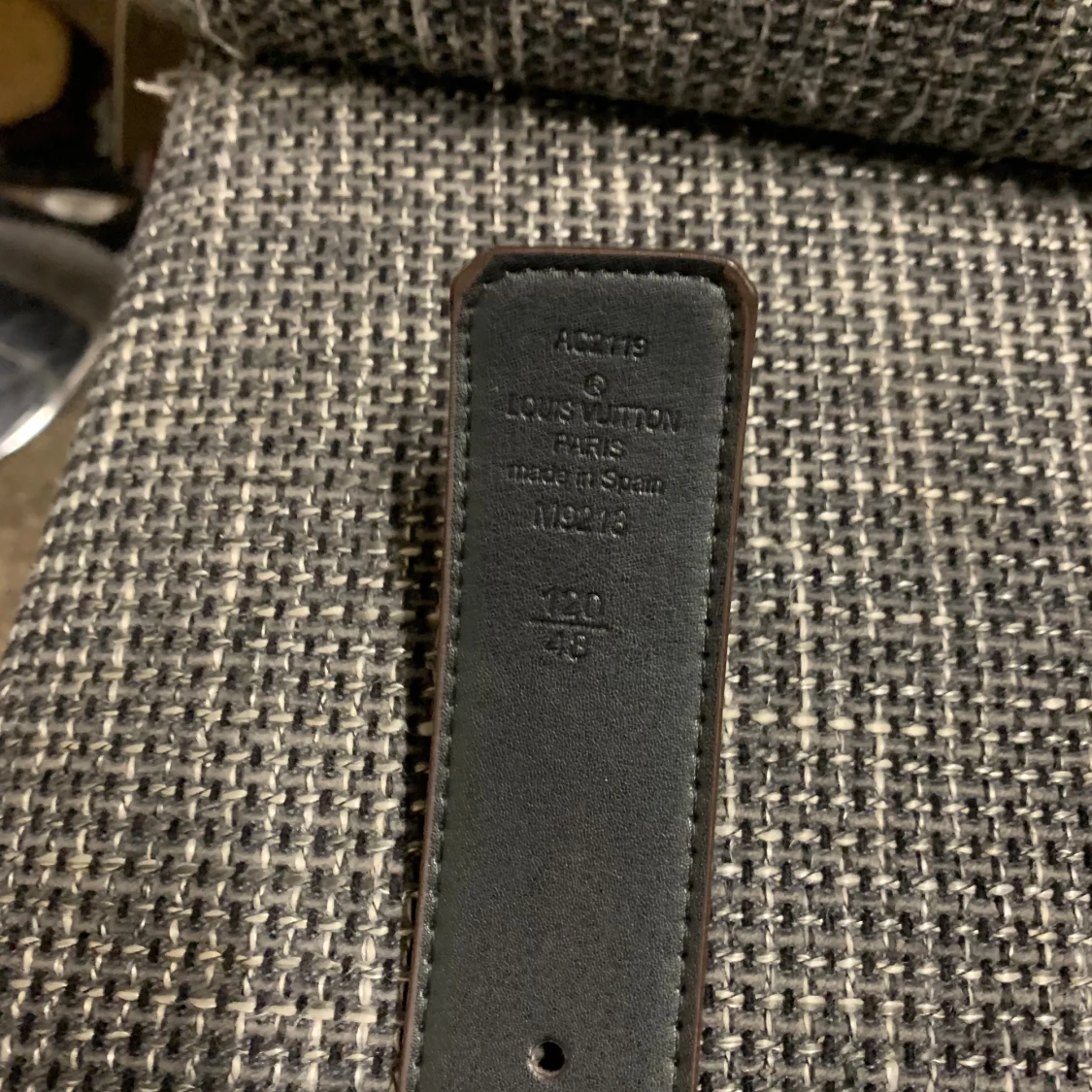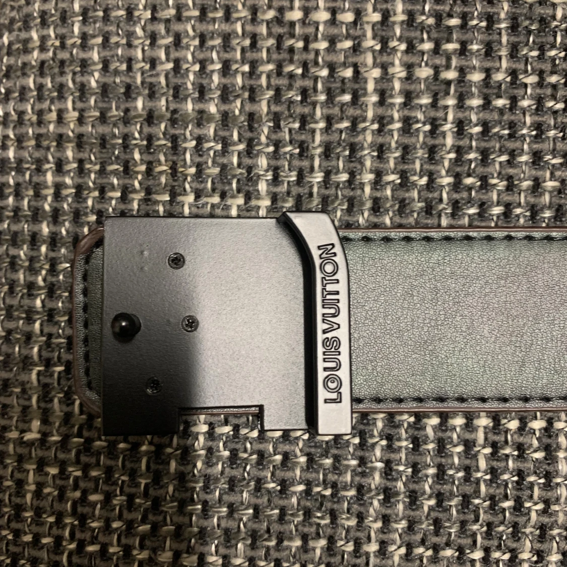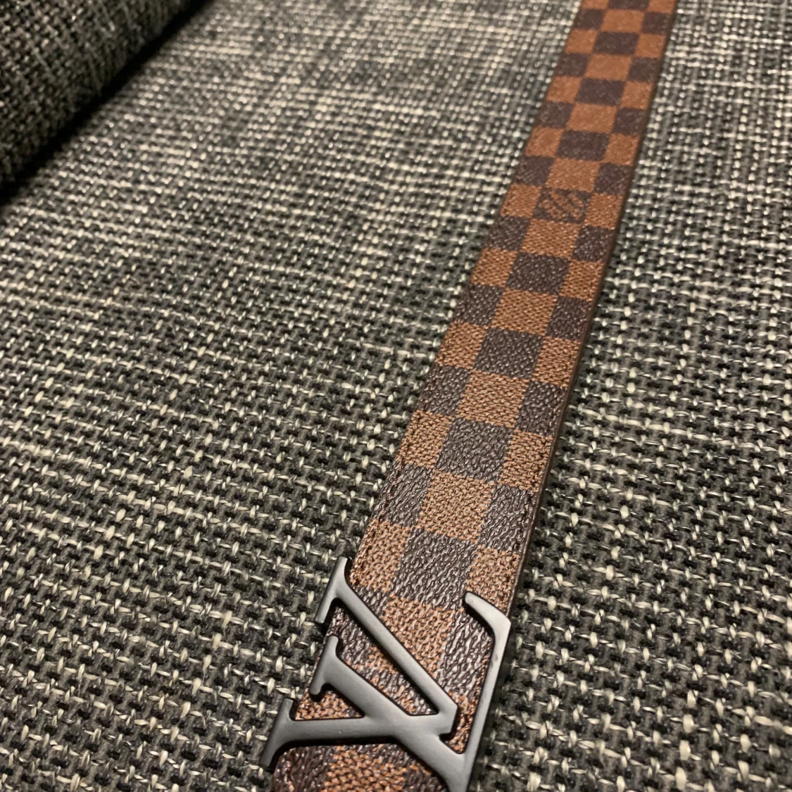 Säljer ett Louis Vuitton bälte i klassiskt brunt och mörkbrunt rutigt mönster med stor LV-logga i svart metall framtill. Bältet är gjort i äkta skinn och har exklusiv känsla, perfekt för dig som vill sticka ut med en ikonisk accessoar.