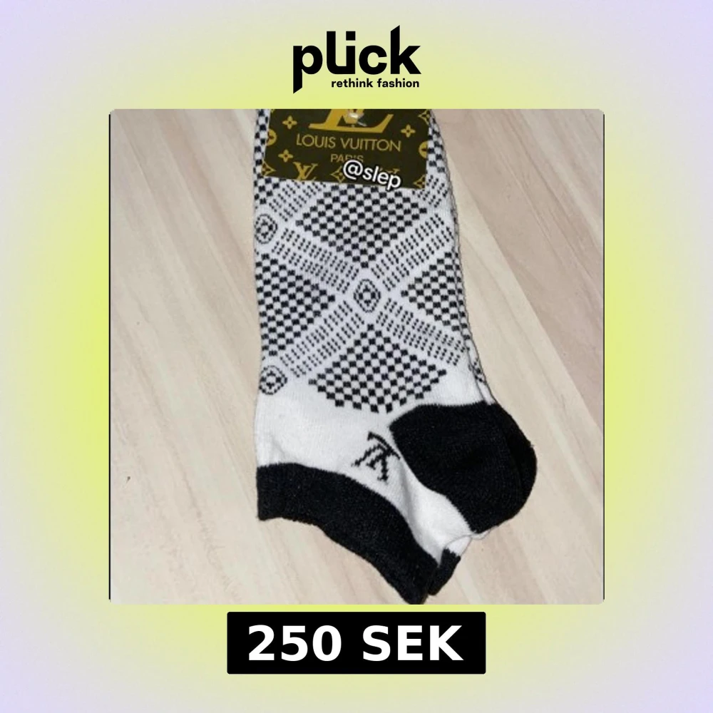 Snygga strumpor från Louis Vuitton med svartvitt rutmönster och klassisk LV-logga vid tån. Strumporna är låga och har svarta detaljer vid tå och häl. Perfekt för dig som gillar exklusiva accessoarer med unik design.