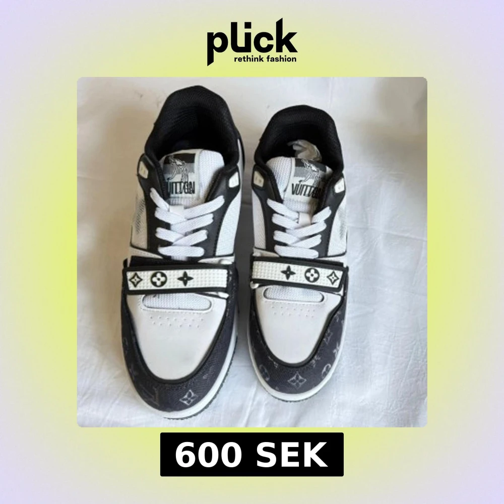 Snygga sneakers från Louis Vuitton i svart och vitt med klassiskt monogrammönster på tå och rem. Skorna har snörning, meshpaneler och en bred rem över foten med LV-loggor. Perfekta för dig som vill sticka ut med en lyxig streetstyle.