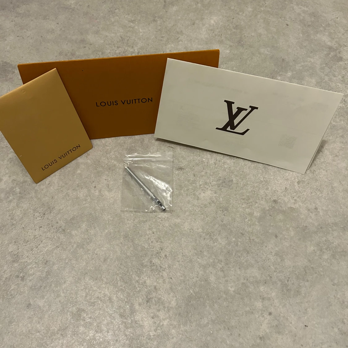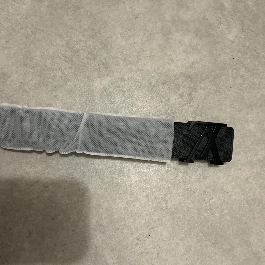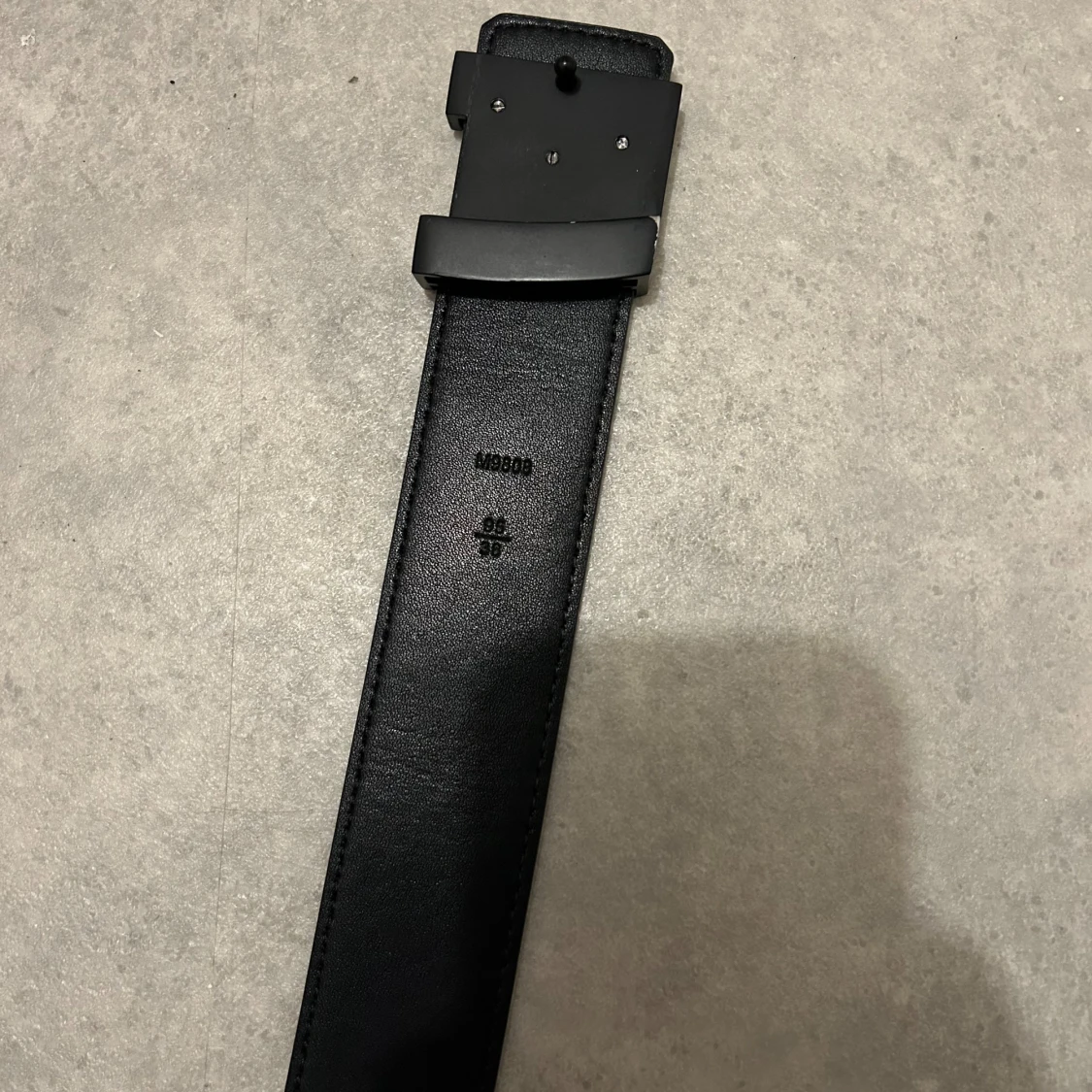 Snyggt Louis Vuitton bälte i svart skinn med klassisk LV-logga i svart metall på spännet. Bältet har ett diskret rutigt mönster och kommer med originalförpackning, dustbag och blått band. Perfekt accessoar för att lyfta din outfit.