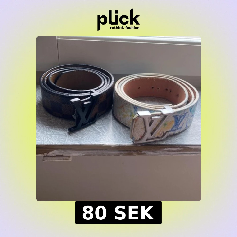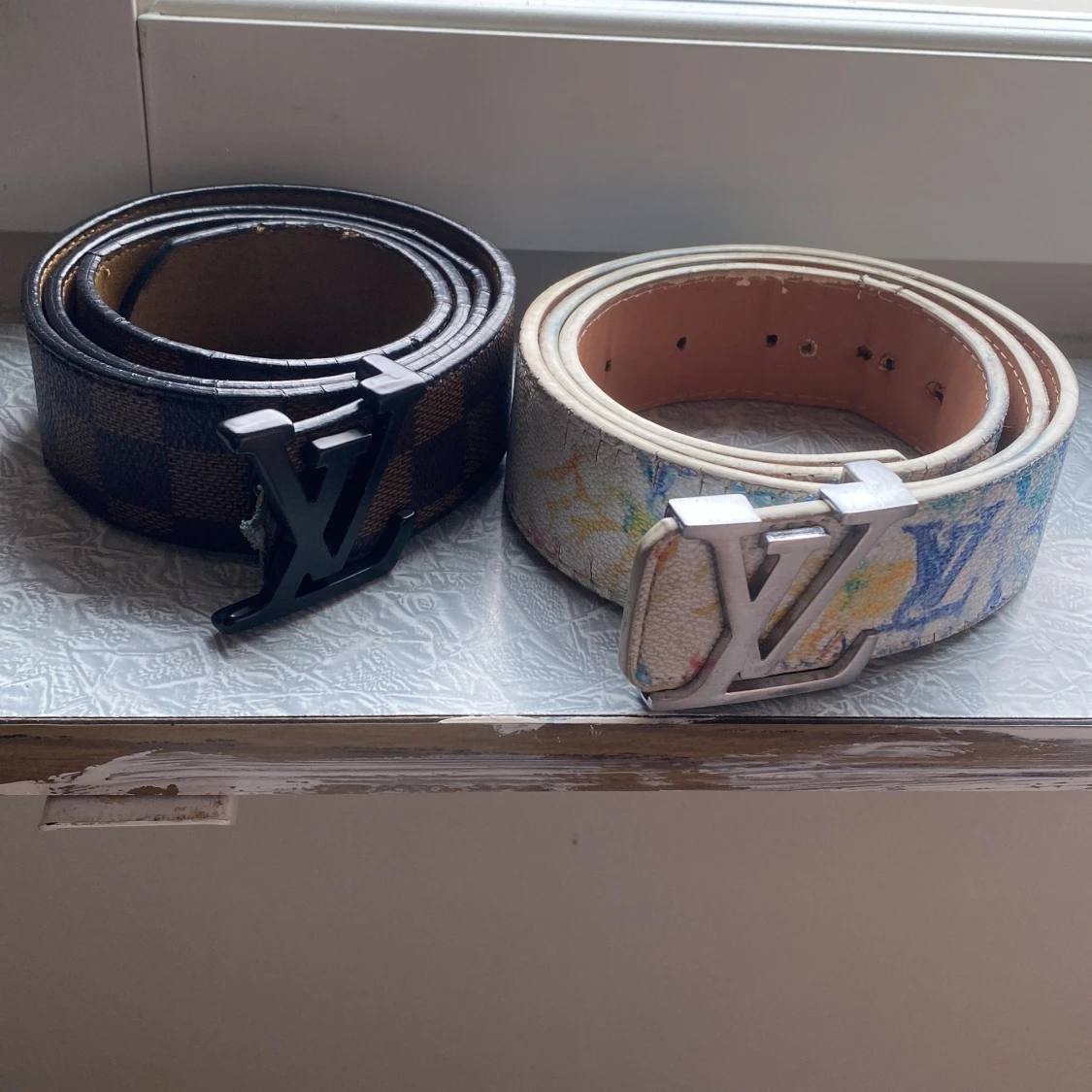 Två snygga Louis Vuitton bälten med ikoniskt LV-spänne. Ett är brunt med rutigt mönster och svart metallspänne, det andra är vitt med färgglada detaljer och silverfärgat spänne. Båda är i klassisk form och tillverkade i skinn med exklusiv känsla.