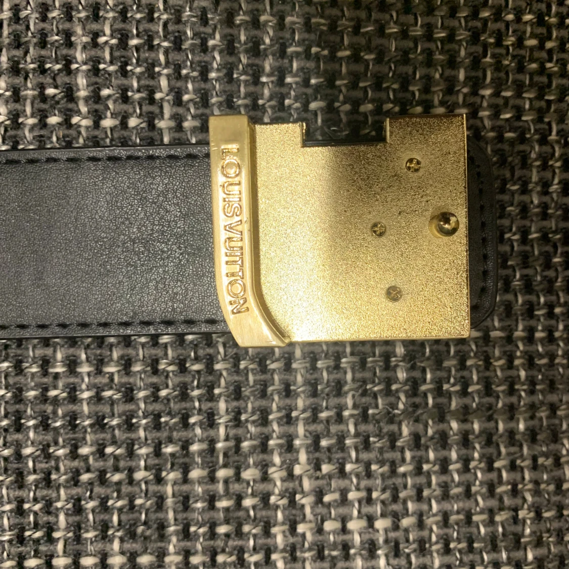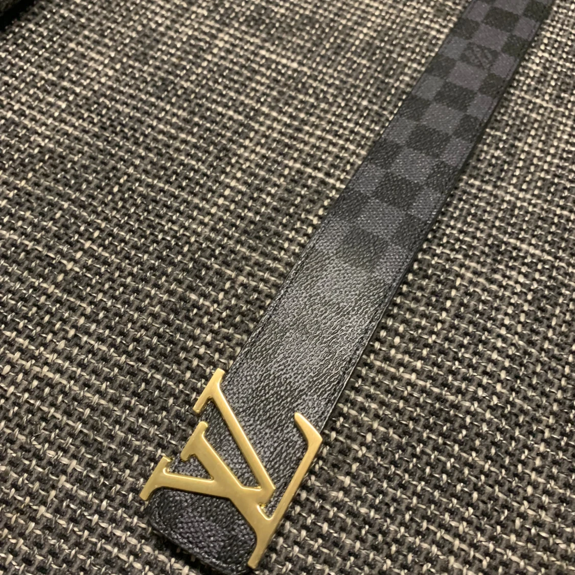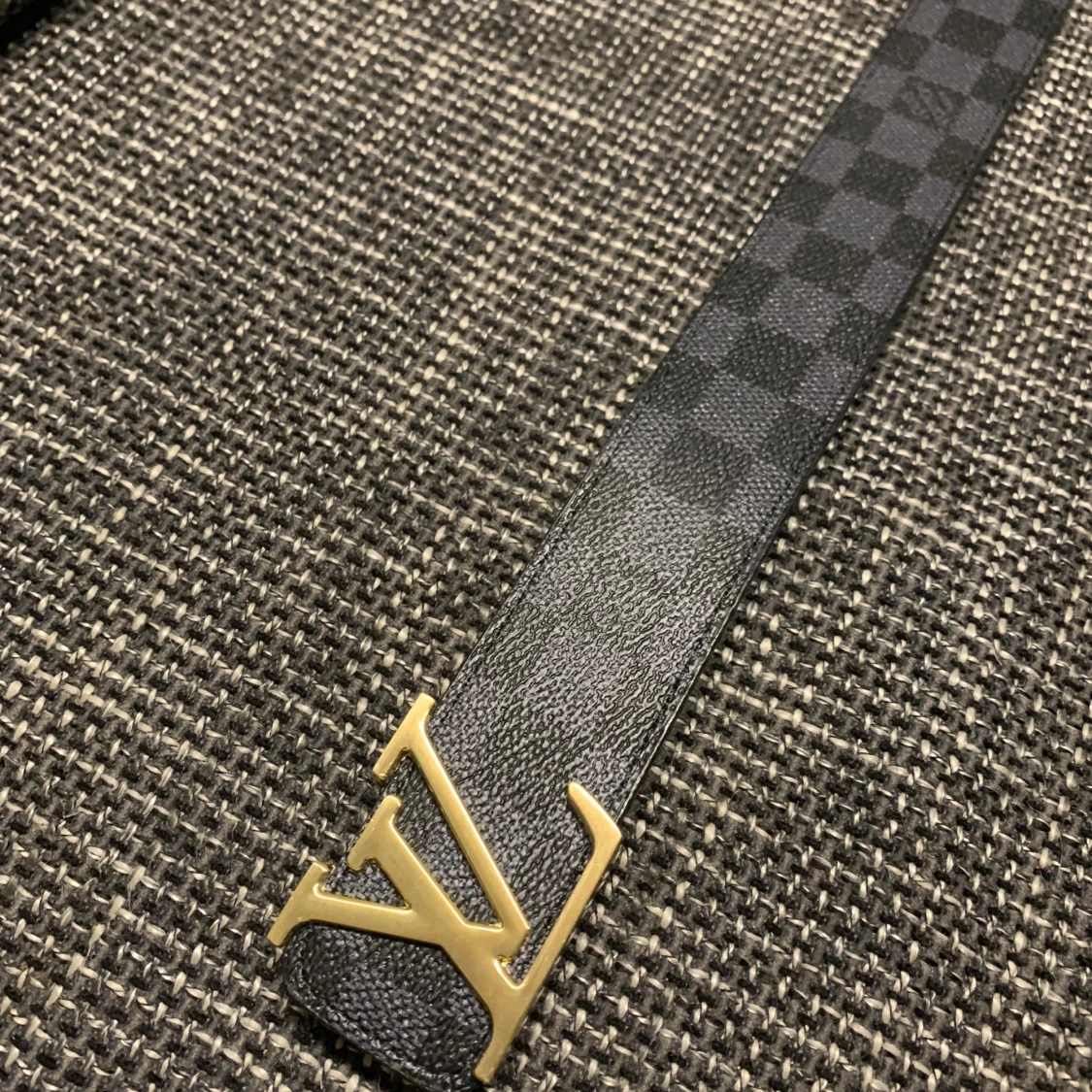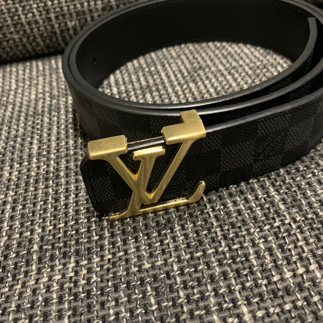 Snyggt Louis Vuitton bälte i svart skinn med klassiskt damier-rutmönster. Bältet har en ikonisk LV-spänne i guldmetall och exklusiva detaljer. Perfekt accessoar för att lyfta din outfit med lyxig känsla och stil.