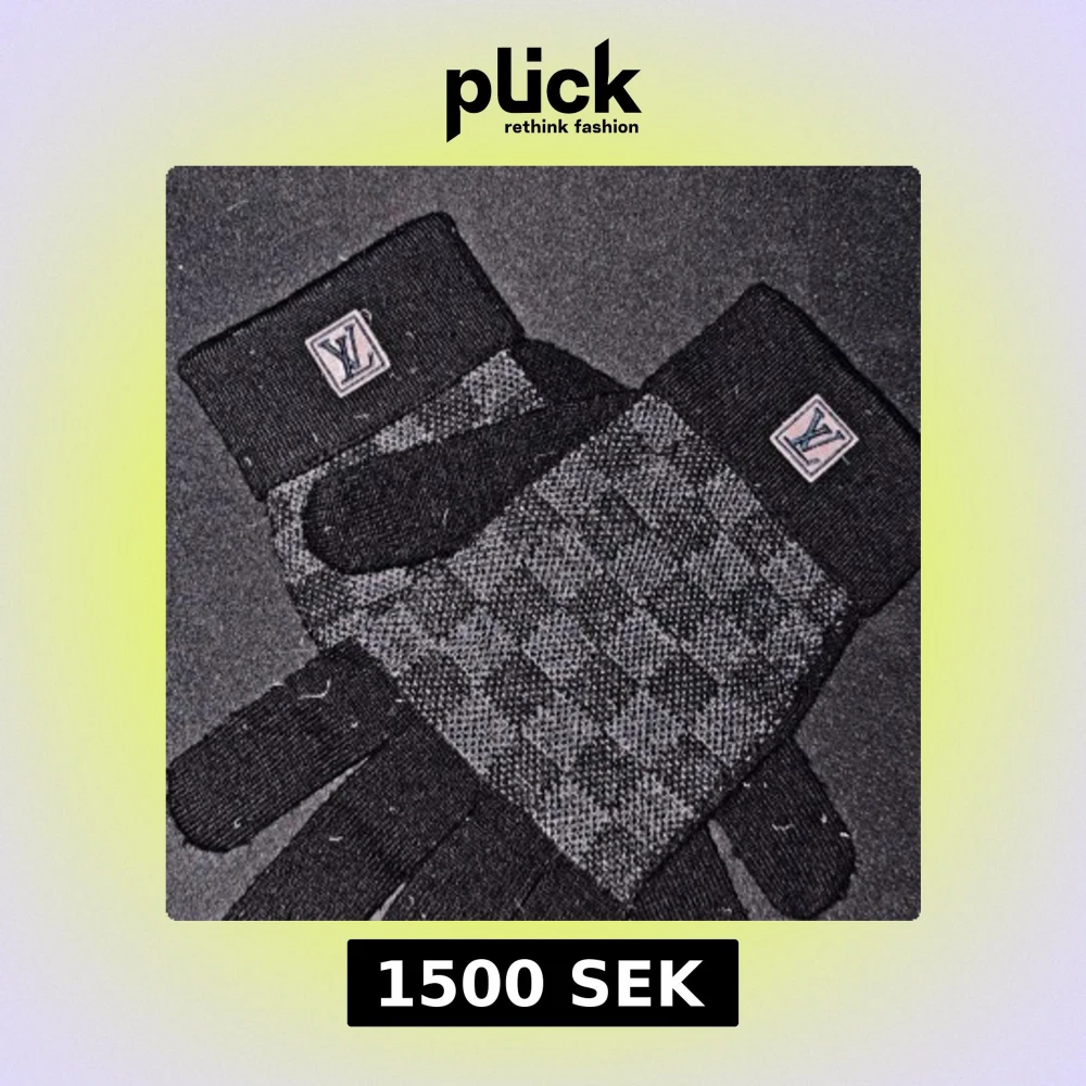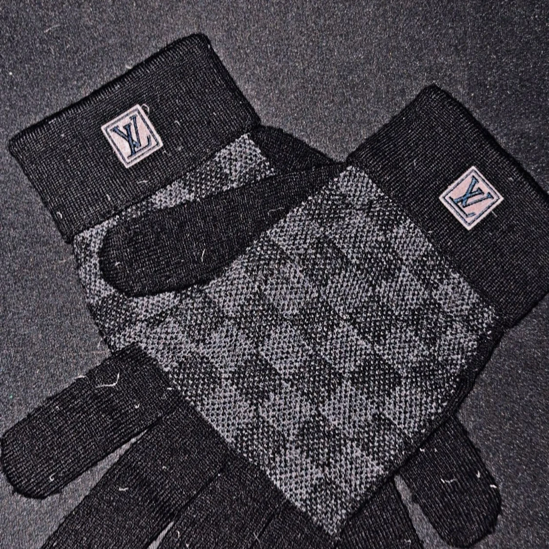 Snygga stickade handskar från Louis Vuitton i svart och grått med klassiskt rutig design. LV-logga på mudden ger en exklusiv touch. Perfekta för att hålla stilen när det är kallt ute.