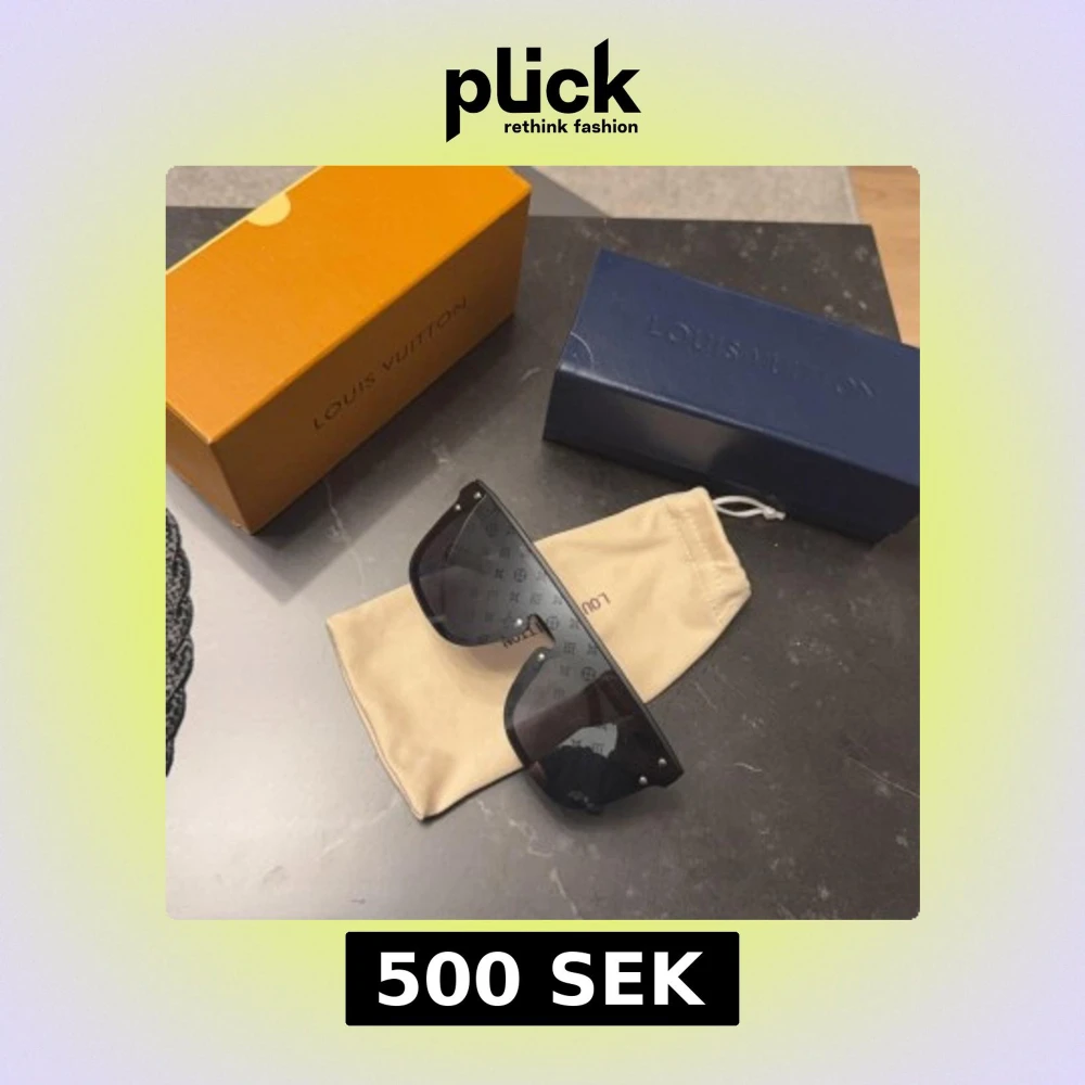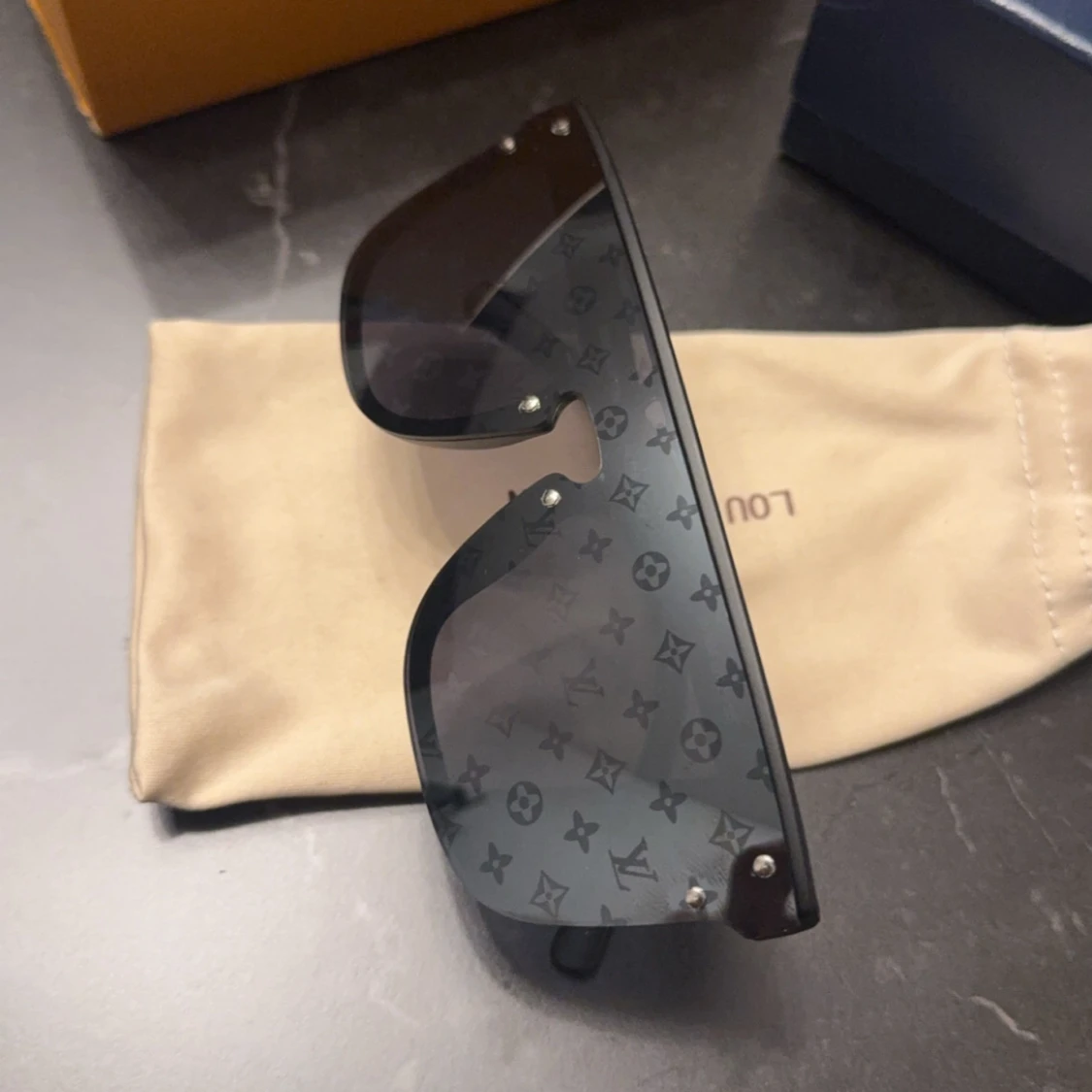 Snygga svarta solglasögon från Louis Vuitton med ett diskret mönster på glasen. De har en modern design med breda skalmar och små nitar i hörnen. Perfekta för en stilren look.