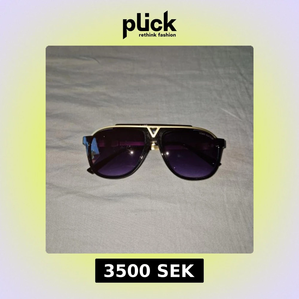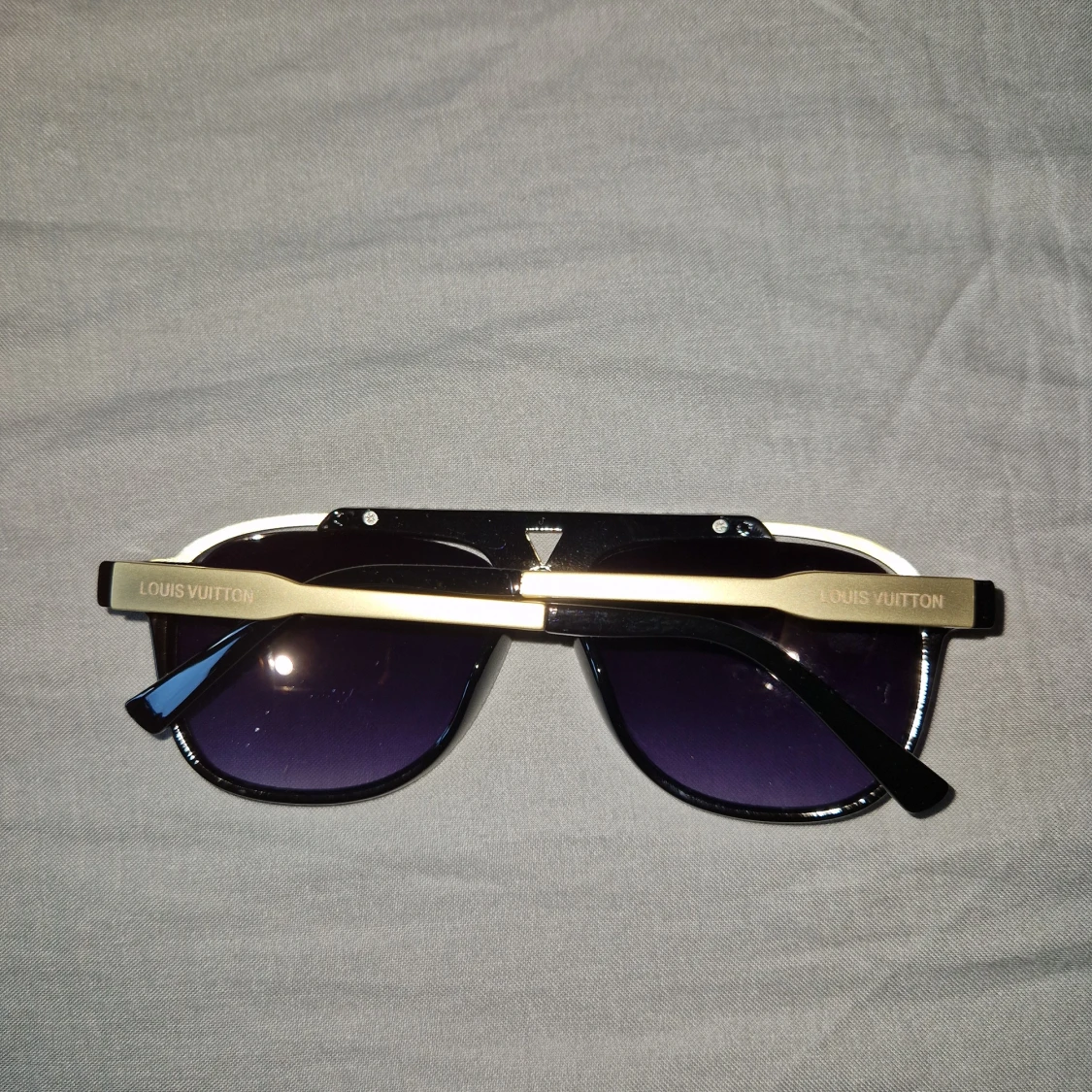 Snygga solglasögon från Louis Vuitton med svart båge och guldiga detaljer. Glasen är mörka med en lila ton och har en cool V-formad detalj framtill. Perfekt accessoar för dig som vill sticka ut med exklusiv stil.