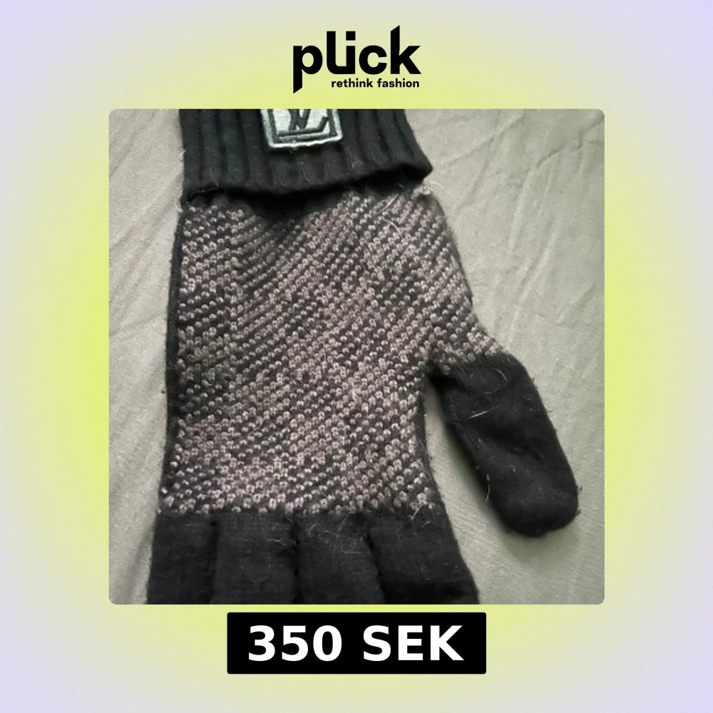 Stickade svarta handskar med gråmelerat mönster och ribbade muddar. Handskarna har en tydlig LV-logga på mudden och är perfekta för kyliga dagar.