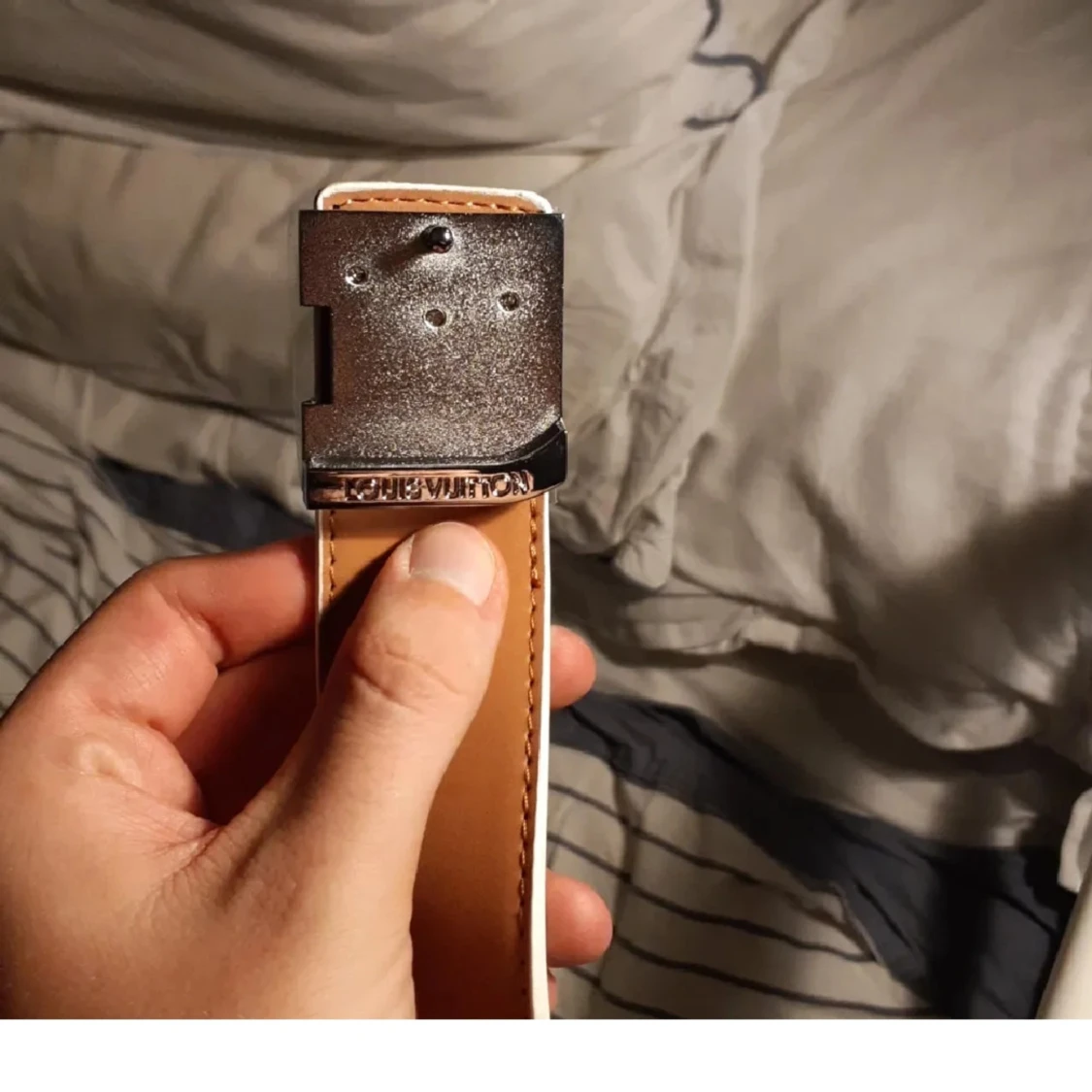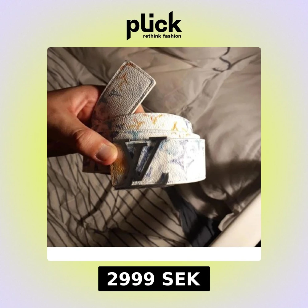 Säljer ett Louis Vuitton bälte i vitt skinn med coola färgstänk i blått, gult och orange. Bältet har en stor LV-logga i silver som spänne och insidan är ljusbrun. Perfekt accessoar för att lyfta din outfit.